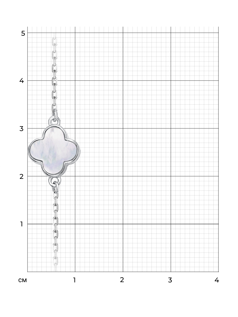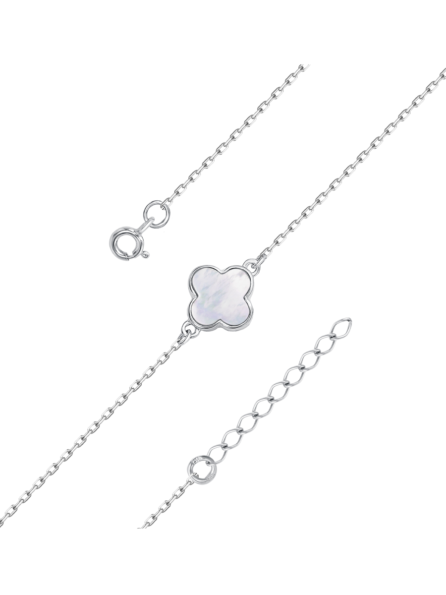 Нежный браслет Клевер, с белым перламутром, выполнен из серебра 925 пробы. Характеристики. Вставка белый перламутр. Высота декоративной части 10,9мм, ширина 15мм, глубина 7,7мм. Замок шпрингельный. Есть возможность увеличить длину браслета на 30мм за счёт дополнительных звеньев. Отличным дополнением к браслету будут пусеты арт.02-00-001-35р и колье арт.04-00-030-35р. Берегите изделие от воздействия влаги, любых спиртосодержащих растворов и жидкостей, а также парфюма. Для ухода и чистки желательно использовать специальные салфетки для серебра. Приятным дополнением к украшению является фирменная упаковка. Значение веса в характеристиках примерное и может отличаться от фактического.