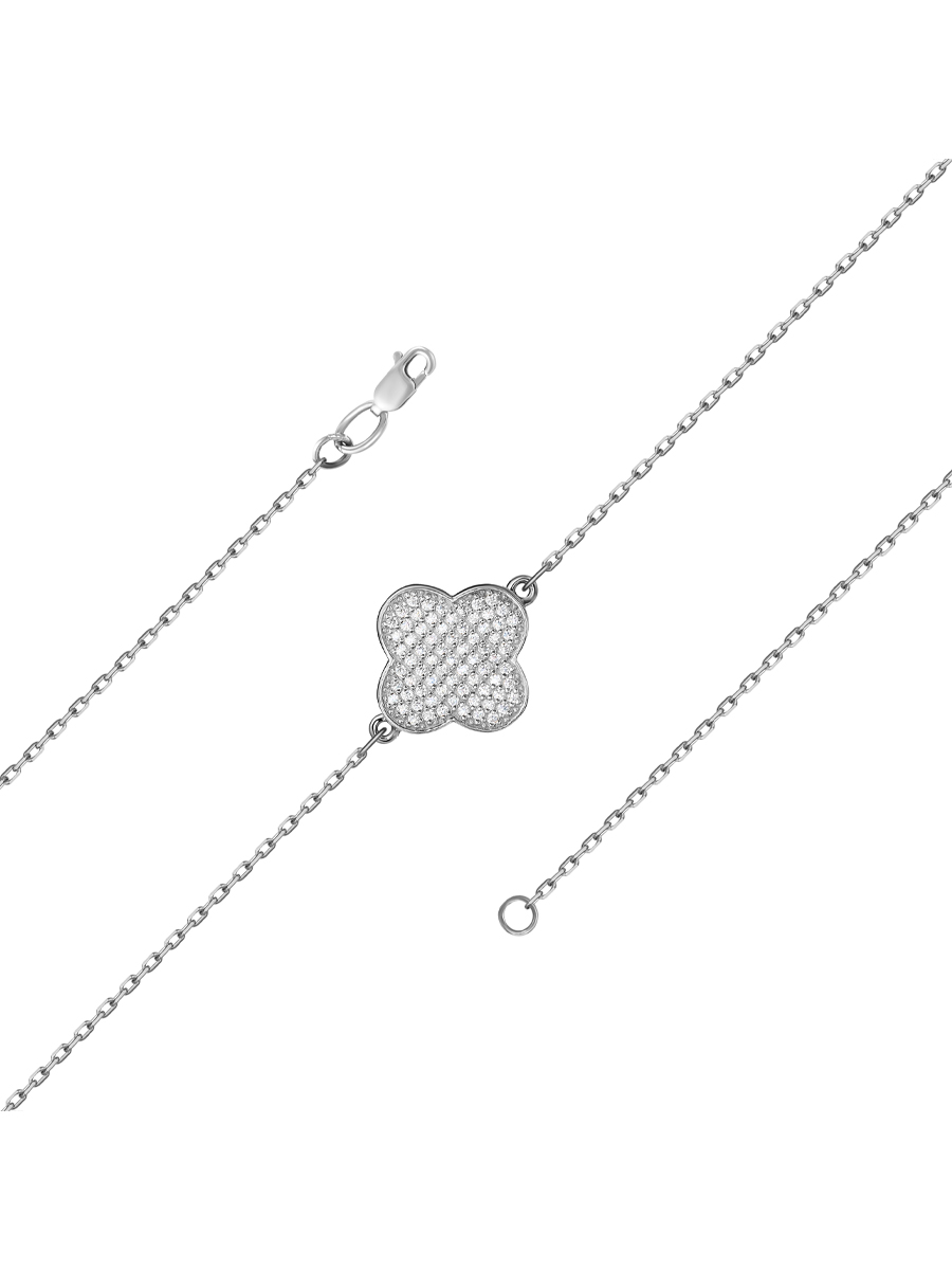 Браслет Белый клевер выполнен из серебра 925 пробы с родиевым покрытием. Характеристики. Вставка 73 недрагоценных бесцветных фианита 1мм огранка круг. Высота декоративной части 15,3мм, ширина 19мм, глубина 2,6мм. Замок карабин. Отличным дополнением к браслету будут кольцо арт.1-08-018-12р, серьги арт.2-08-018-12р и колье арт.5-08-018-12р. Берегите изделие от воздействия влаги, любых спиртосодержащих растворов и жидкостей, а также парфюма. Для ухода и чистки желательно использовать специальные салфетки для серебра. Приятным дополнением к ювелирному украшению является фирменная упаковка. Значение веса в характеристиках является примерным и может отличаться от фактического.