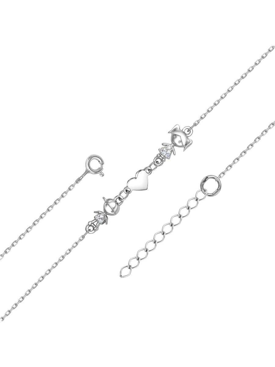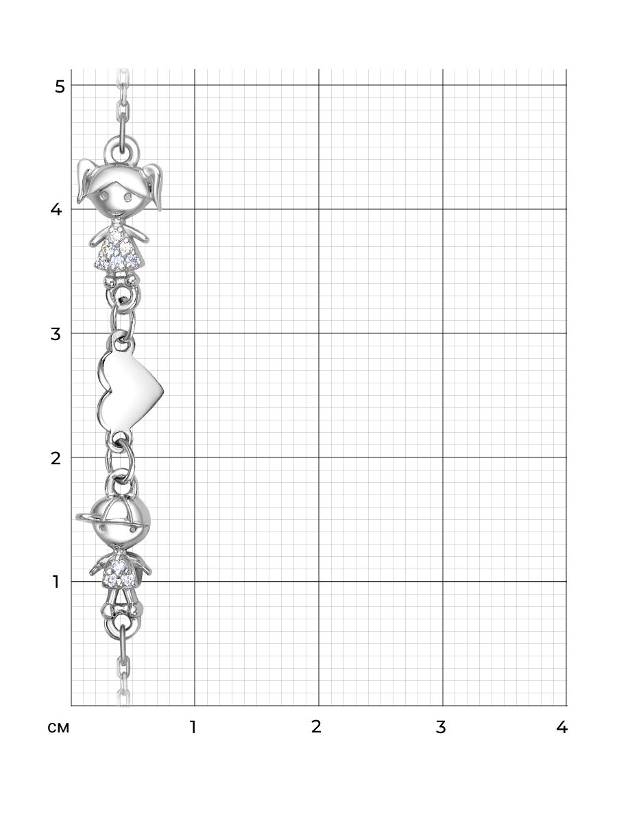Браслет Мальчик и Девочка выполнен из серебра 925 пробы с родиевым покрытием. Характеристики. Вставка 12 недрагоценных бесцветных фианитов 1мм огранка круг. Длина декоративной части 40мм, высота 7мм. Замок шпрингельный. Есть возможность удлинить браслет на 30мм. Берегите изделие от воздействия влаги, любых спиртосодержащих растворов и жидкостей, а также парфюма. Для ухода и чистки желательно использовать специальные салфетки для серебра. Приятным дополнением к ювелирному украшению является фирменная упаковка. Значения веса и габаритов в характеристиках являются примерными и могут отличаться от фактических.