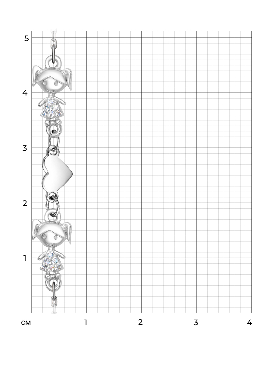 Браслет Две Девочки выполнен из серебра 925 пробы с родиевым покрытием. Характеристики. Вставка 9 недрагоценных бесцветных фианитов 1мм огранка круг. Длина декоративной части 40мм, высота 7мм. Замок шпрингельный. Есть возможность удлинить браслет на 30мм. Берегите изделие от воздействия влаги, любых спиртосодержащих растворов и жидкостей, а также парфюма. Для ухода и чистки желательно использовать специальные салфетки для серебра. Приятным дополнением к ювелирному украшению является фирменная упаковка. Значения веса и габаритов в характеристиках являются примерными и могут отличаться от фактических.