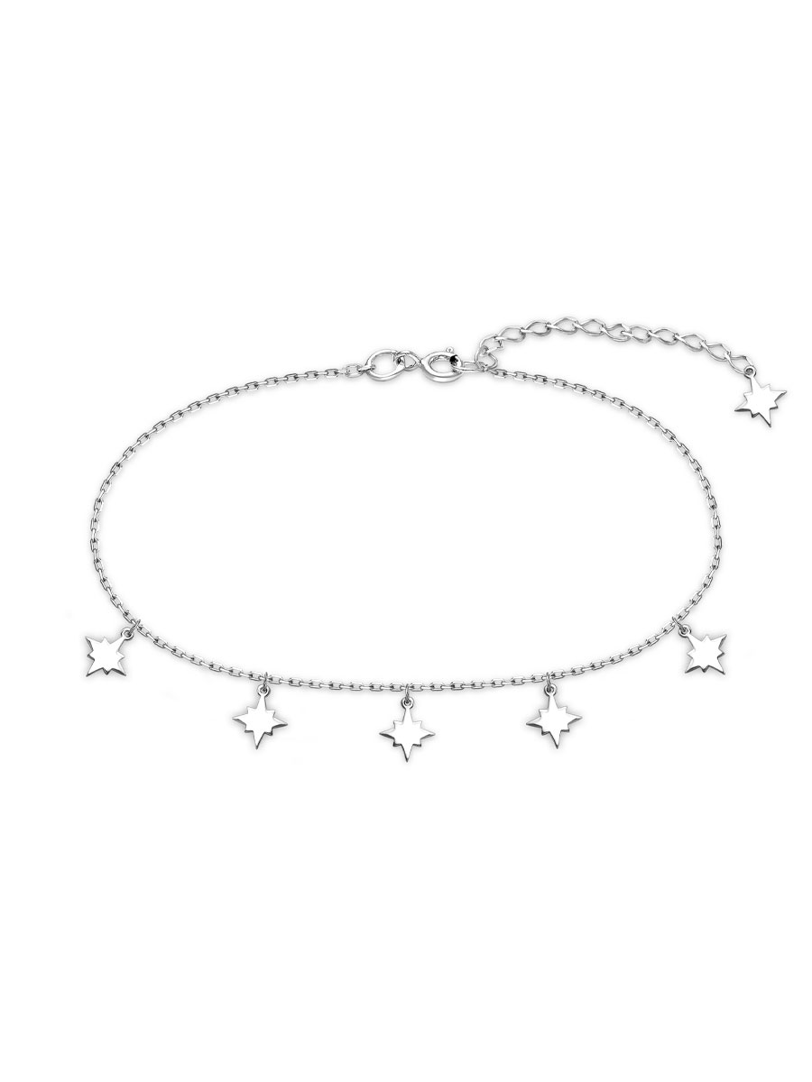 Браслет выполнен из серебра 925 пробы с родиевым покрытием. Характеристики. Ширина звезды 8 мм, высота по диагонали 5,7 мм. Расстояние между подвесками 15 мм. Есть возможность удлинить браслет на 40 мм. Замок шпрингельный. Отличным дополнением к браслету будет колье арт.5-00-441-00р. Берегите изделие от воздействия влаги, любых спиртосодержащих растворов и жидкостей, а также парфюма. Для ухода и чистки желательно использовать специальные салфетки для серебра. Приятным дополнением к ювелирному украшению является фирменная упаковка. Значение веса и габаритов в характеристиках примерные и могут отличаться от фактических.