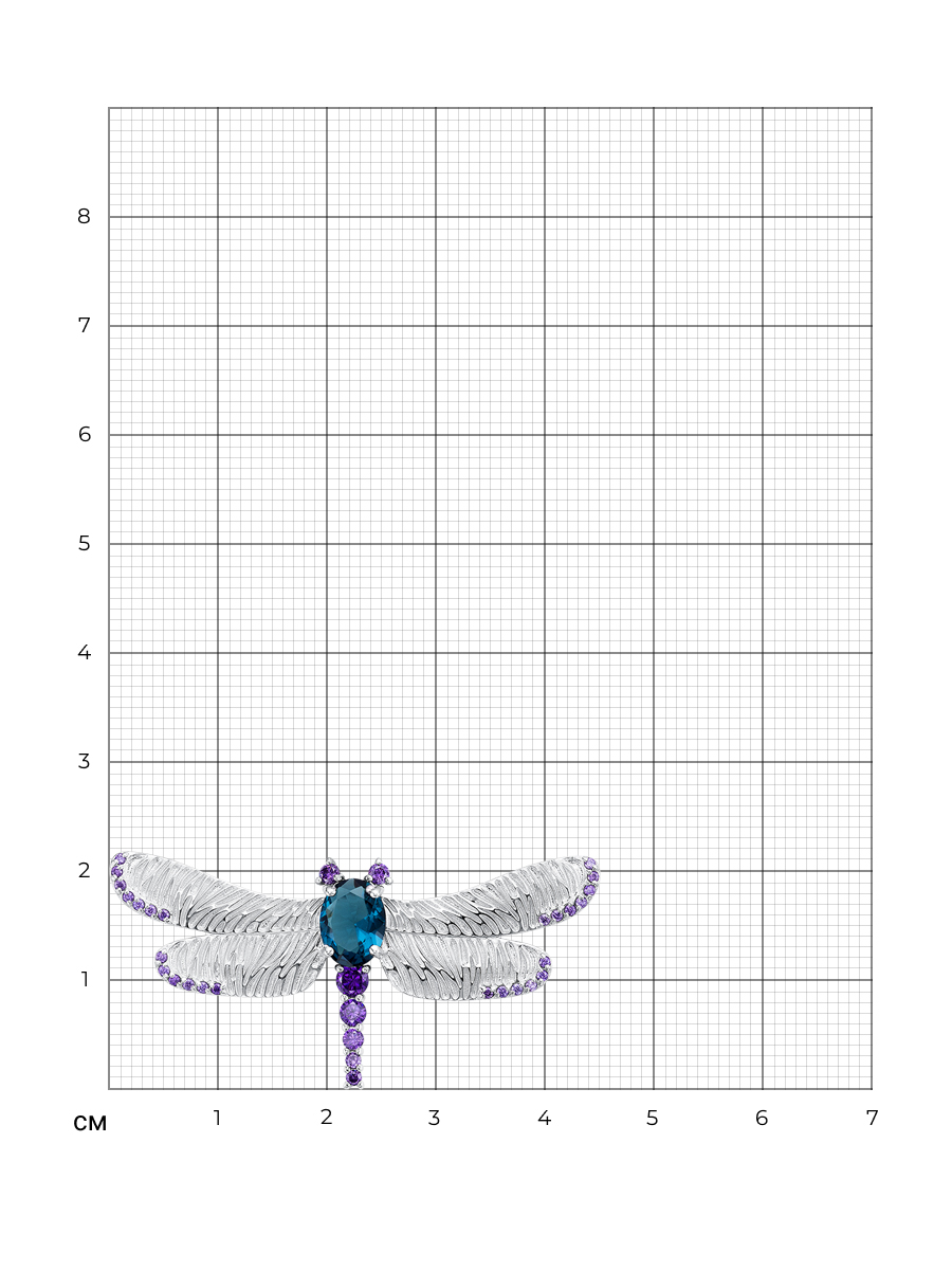 Брошь Стрекоза с плавленым кварцем цвет Лондон топаз из серебра 925 пробы с родиевым покрытием. Характеристики. Вставка 1 плавленый кварц 8х6мм цвет Лондон топаз огранка овал, 26 недрагоценных фианитов 1мм цвет аметист огранка круг, 1 недрагоценный фианит 3мм цвет аметист огранка круг, 1 недрагоценный фианит 2,5мм цвет аметист огранка круг. Высота броши 22мм, ширина 44,5мм, глубина вместе с замком 7,5мм, глубина без учёта замка 4,5мм. Отличным дополнением к броши будет подвеска арт.3-06-267-05р. Берегите изделие от воздействия влаги, любых спиртосодержащих растворов и жидкостей, а также парфюма. Для ухода и чистки желательно использовать специальные салфетки для серебра. Приятным дополнением к ювелирному украшению является фирменная упаковка. Значение веса в характеристиках является примерным и может отличаться от фактического.