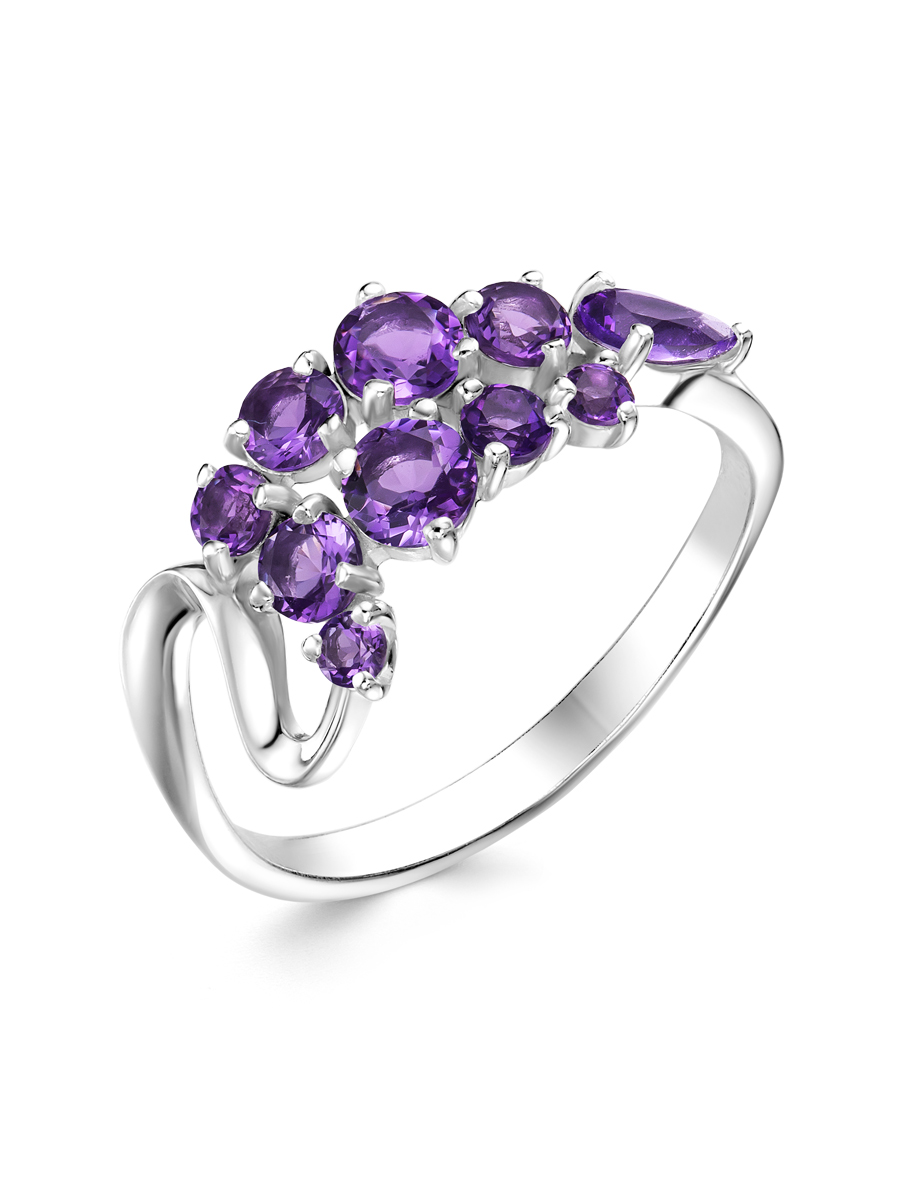 Кольцо выполнено из серебра 925 пробы с родиевым покрытием. Характеристики. Вставка 1 натуральный аметист 5х3 мм цвет фиолетовый огранка груша, 2 натуральных аметиста 3,5 мм цвет фиолетовый огранка круг, 3 натуральных аметиста 3 мм цвет фиолетовый огранка круг, 2 натуральных аметиста 2,5 мм цвет фиолетовый огранка круг, 2 натуральных аметиста 2 мм цвет фиолетовый огранка круг. Высота декоративной части кольца 9,5 мм. Ширина шинки 2 мм. Отличным дополнением к кольцу будут серьги арт. 2-04-175-13р. Берегите изделие от воздействия влаги, любых спиртосодержащих растворов и жидкостей, а также парфюма. Для ухода и чистки желательно использовать специальные салфетки для серебра. Приятным дополнением к ювелирному украшению является фирменная упаковка. Значение веса и габаритов в характеристиках примерные и могут отличаться от фактических.