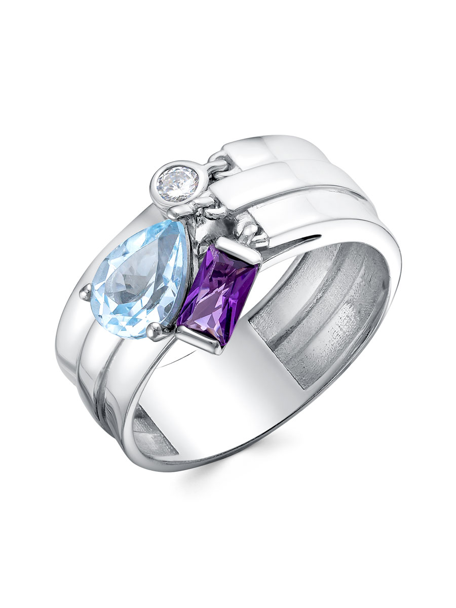 Кольцо выполнено из серебра 925 пробы с родиевым покрытием. Характеристики. Вставка 1 натуральный аметист 5х3 мм огранка багет, 1 натуральный топаз 7х5 мм цвет Скай огранка груша, 1 недрагоценный бесцветный фианит 2,5 мм огранка круг. Ширина кольца 7 мм. Касты подвижные. Берегите изделие от воздействия влаги, любых спиртосодержащих растворов и жидкостей, а также парфюма. Для ухода и чистки желательно использовать специальные салфетки для серебра. Приятным дополнением к ювелирному украшению является фирменная упаковка. Значение веса и габаритов в характеристиках примерные и могут отличаться от фактических.