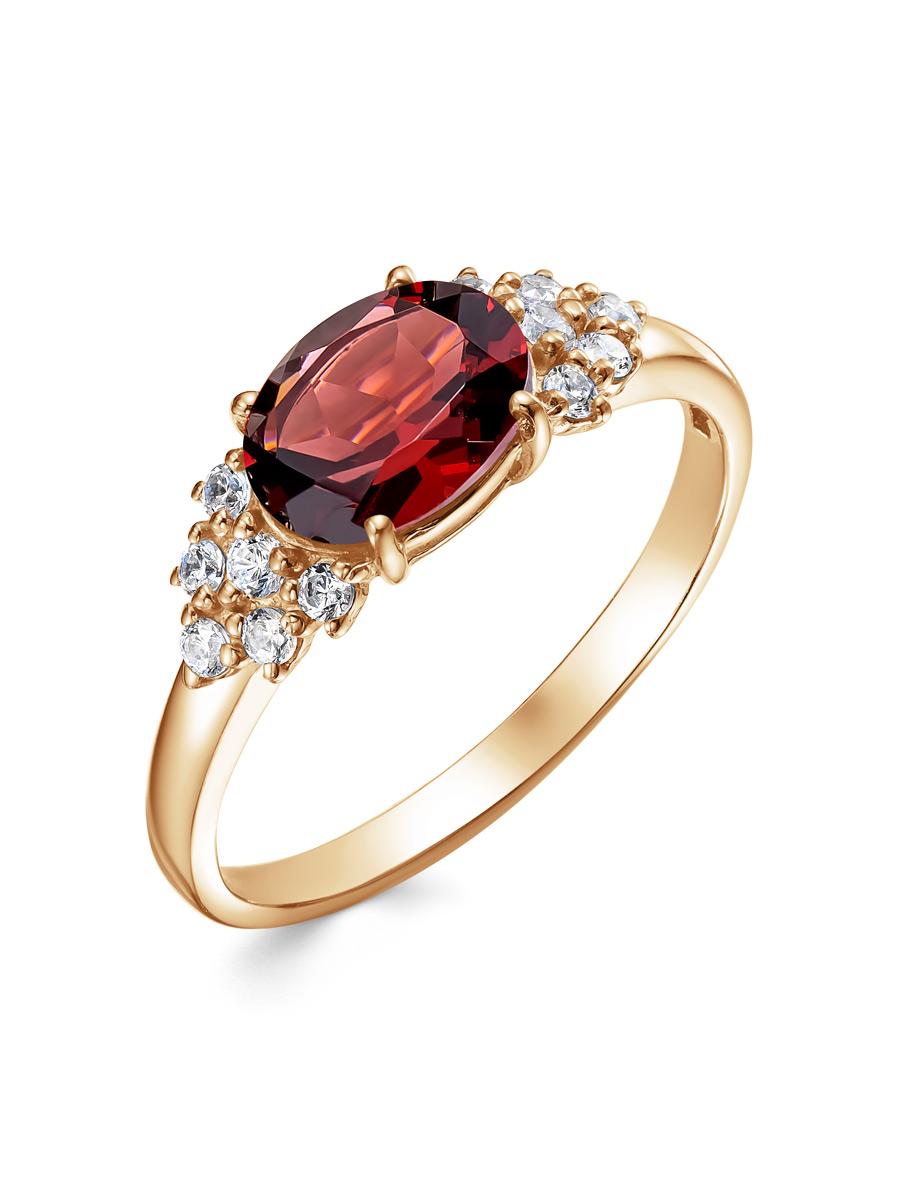 Кольцо выполнено из серебра 925 пробы с золотым покрытием. Характеристики. Вставка 1 натуральный гранат 8х6 мм огранка овал, 2 недрагоценных бесцветных фианита 1,75 мм огранка круг, 10 недрагоценных бесцветных фианитов 1,5 мм огранка круг. Высота декоративной части кольца 6,2 мм, глубина 5,2 мм. Ширина шинки 1,8 мм. Отличным дополнением к кольцу будут серьги арт.2-04-207-03з. Берегите изделие от воздействия влаги, любых спиртосодержащих растворов и жидкостей, а также парфюма. Для ухода и чистки желательно использовать специальные салфетки для серебра. Приятным дополнением к ювелирному украшению является фирменная упаковка. Значение веса и габаритов в характеристиках примерные и могут отличаться от фактических.