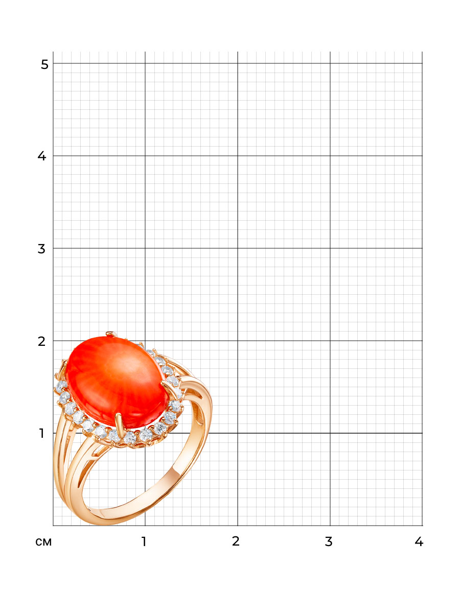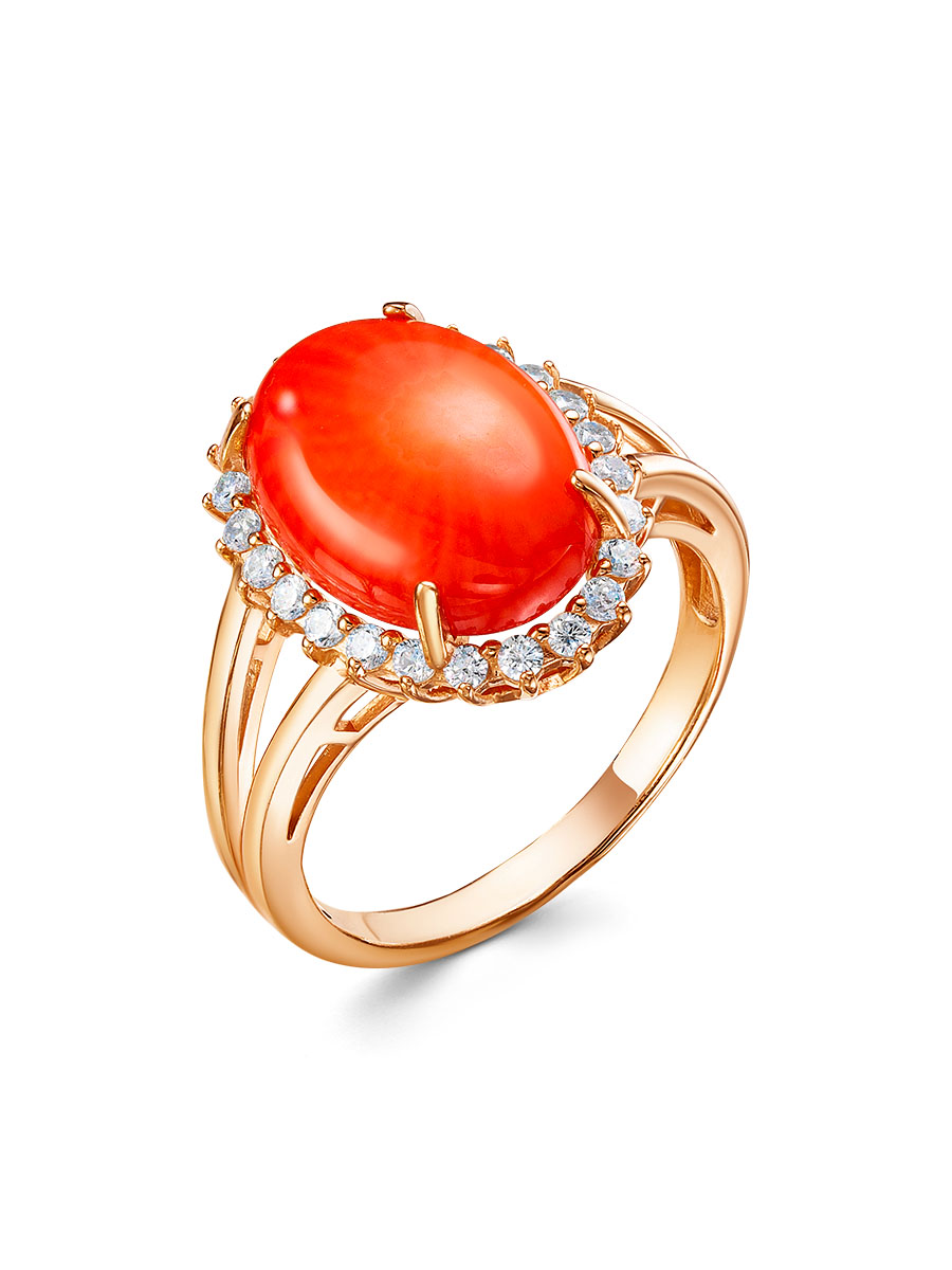 Кольцо выполнено из серебра 925 пробы с золотым покрытием. Характеристики. Вставка 1 натуральный коралл 14х10мм огранка овал, 24 бесцветных недрагоценных фианита 1,5мм огранка круг. Высота декоративной части 17,5мм, ширина 13,5мм, глубина декоративной части с камнем 7,8мм. Ширина шинки 2,3мм. Отличным дополнением к кольцу будут серьги арт.2-04-255-28з. Берегите изделие от воздействия влаги, любых спиртосодержащих растворов и жидкостей, а также парфюма. Для ухода и чистки желательно использовать специальные салфетки для серебра. Приятным дополнением к ювелирному украшению является фирменная упаковка. Значения веса и габаритов в характеристиках являются примерными и могут отличаться от фактических.
