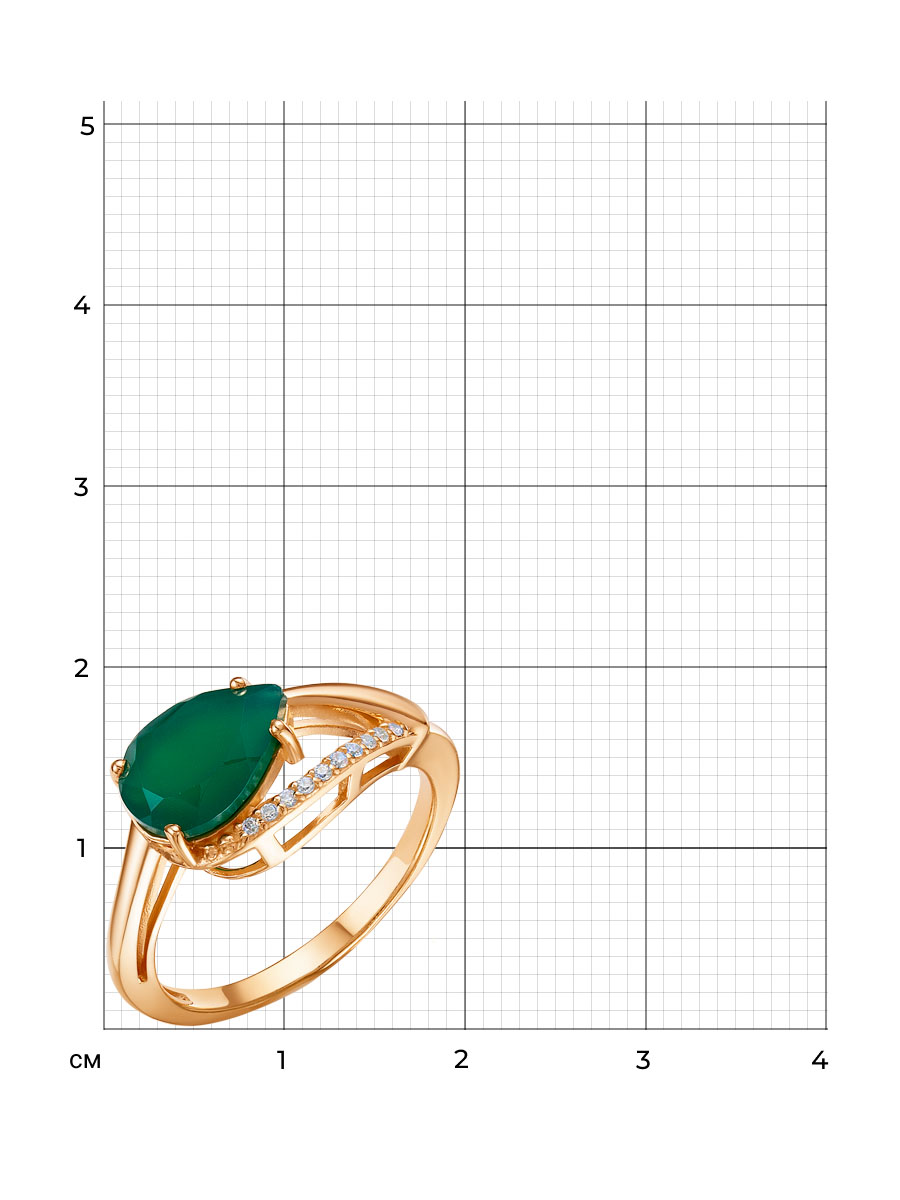 Кольцо выполнено из серебра 925 пробы с золотым покрытием. Характеристики. Вставка 1 натуральный агат 10х7мм цвет зелёный огранка груша, 10 недрагоценных бесцветных фианитов 1мм огранка круг. Высота декоративной части 8,5мм, глубина вместе с камнем 6,5мм. Ширина шинки 1,8мм. Берегите изделие от воздействия влаги, любых спиртосодержащих растворов и жидкостей, а также парфюма. Для ухода и чистки желательно использовать специальные салфетки для серебра. Приятным дополнением к украшению является фирменная упаковка. Значение веса в характеристиках является примерным и может отличаться от фактического.