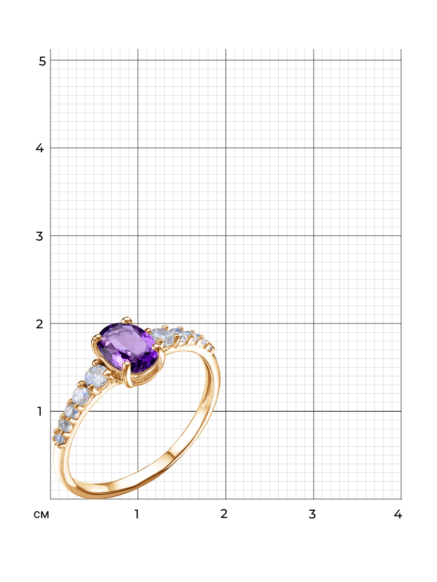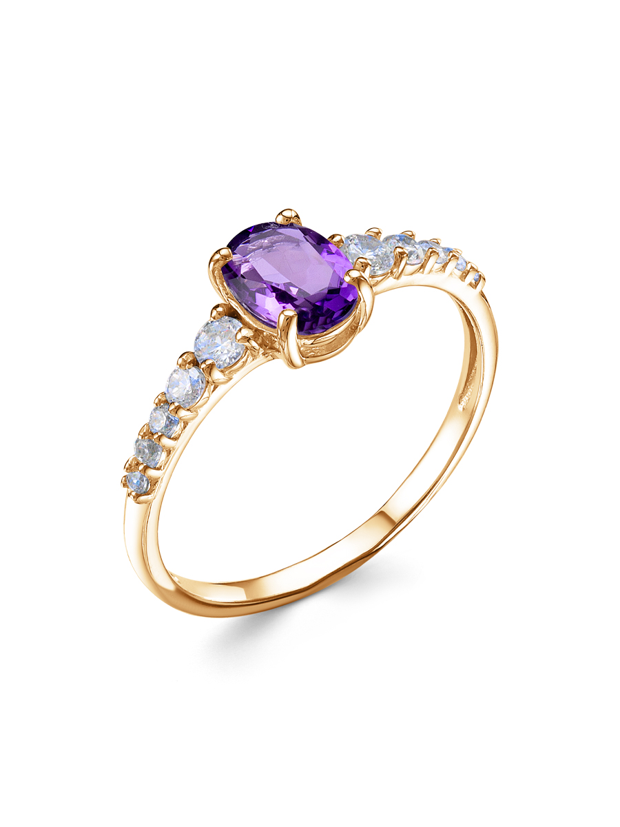 Кольцо с натуральным аметистом выполнено из серебра 925 пробы с золотым покрытием. Характеристики. Вставка 1 натуральный аметист 7х5мм цвет фиолетовый огранка овал, 2 недрагоценных бесцветных фианита 1,25мм огранка круг, 4 недрагоценных бесцветных фианита 1,5мм огранка круг, 2 недрагоценных бесцветных фианита 2мм огранка круг, 2 недрагоценных бесцветных фианита 2,5мм огранка круг. Ширина декоративной части кольца 7мм, глубина вместе с камнем 3,6мм. Ширина шинки 1,6мм. Отличным дополнением к кольцу будут серьги арт.2-04-289-13з и подвеска арт.3-04-289-13з. Берегите изделие от воздействия влаги, любых спиртосодержащих растворов и жидкостей, а также парфюма. Для ухода и чистки желательно использовать специальные салфетки для серебра. Приятным дополнением к ювелирному украшению является фирменная упаковка. Значение веса и габаритов в характеристиках примерные и могут отличаться от фактических.