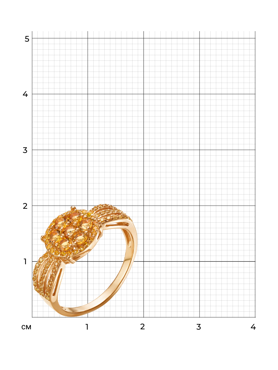 Кольцо выполнено из серебра 925 пробы с золотым покрытием. Характеристики. Вставка 7 натуральных цитринов 2,75мм цвет жёлтый огранка круг, 66 недрагоценных фианитов 1мм цвет жёлтый огранка круг. Высота декоративной части кольца 10,5мм, глубина вместе с камнем 3мм. Ширина шинки 1,6мм. Отличным дополнением к кольцу будут серьги арт.2-04-320-34р. Берегите изделие от воздействия влаги, любых спиртосодержащих растворов и жидкостей, а также парфюма. Для ухода и чистки желательно использовать специальные салфетки для серебра. Приятным дополнением к ювелирному украшению является фирменная упаковка. Значение веса и габаритов в характеристиках примерные и могут отличаться от фактических.
