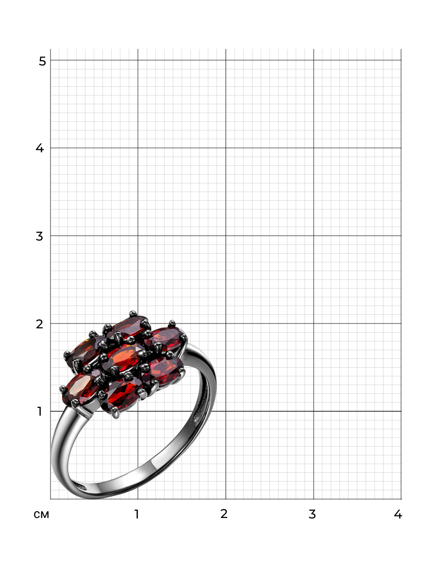 Кольцо выполнено из серебра 925 пробы с покрытием родий и клеар. Характеристики. Вставка 7 натуральных гранатов 5х3 мм огранка овал. Высота декоративной части кольца 10 мм, ширина 15,3 мм. Ширина шинки 2 мм. Отличным дополнением к кольцу будут серьги арт. 2-04-330-03чр. Берегите изделие от воздействия влаги, любых спиртосодержащих растворов и жидкостей, а также парфюма. Для ухода и чистки желательно использовать специальные салфетки для серебра. Приятным дополнением к ювелирному украшению является фирменная упаковка. Значения веса и габаритов в характеристиках примерные и могут отличаться от фактических.