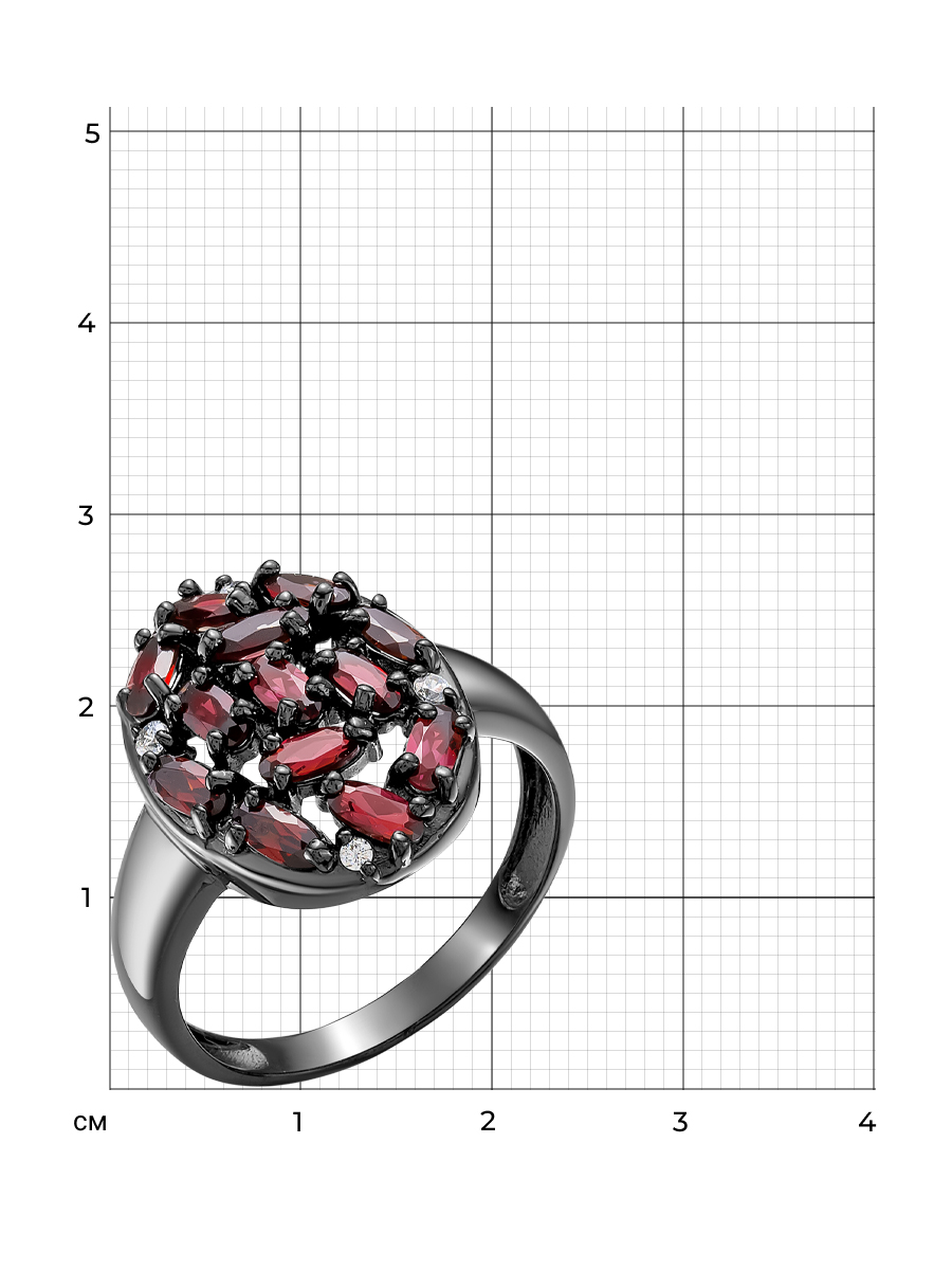 Кольцо выполнено из серебра 925 пробы с родиевым покрытием. Характеристики. Вставка 13 натуральных гранатов 4х2мм цвет гранат огранка овал, 2 бесцветных недрагоценных фианита 1,25мм огранка круг, 2 бесцветных недрагоценных фианита 1,5мм огранка круг. Высота декоративной части кольца 17 мм, ширина 12,5 мм. Ширина шинки 2,5 мм. Отличным дополнением к кольцу будут серьги арт. 2-04-337-03чр. Берегите изделие от воздействия влаги, любых спиртосодержащих растворов и жидкостей, а также парфюма. Для ухода и чистки желательно использовать специальные салфетки для серебра. Приятным дополнением к ювелирному украшению является фирменная упаковка. Значения веса и габаритов в характеристиках примерные и могут отличаться от фактических.