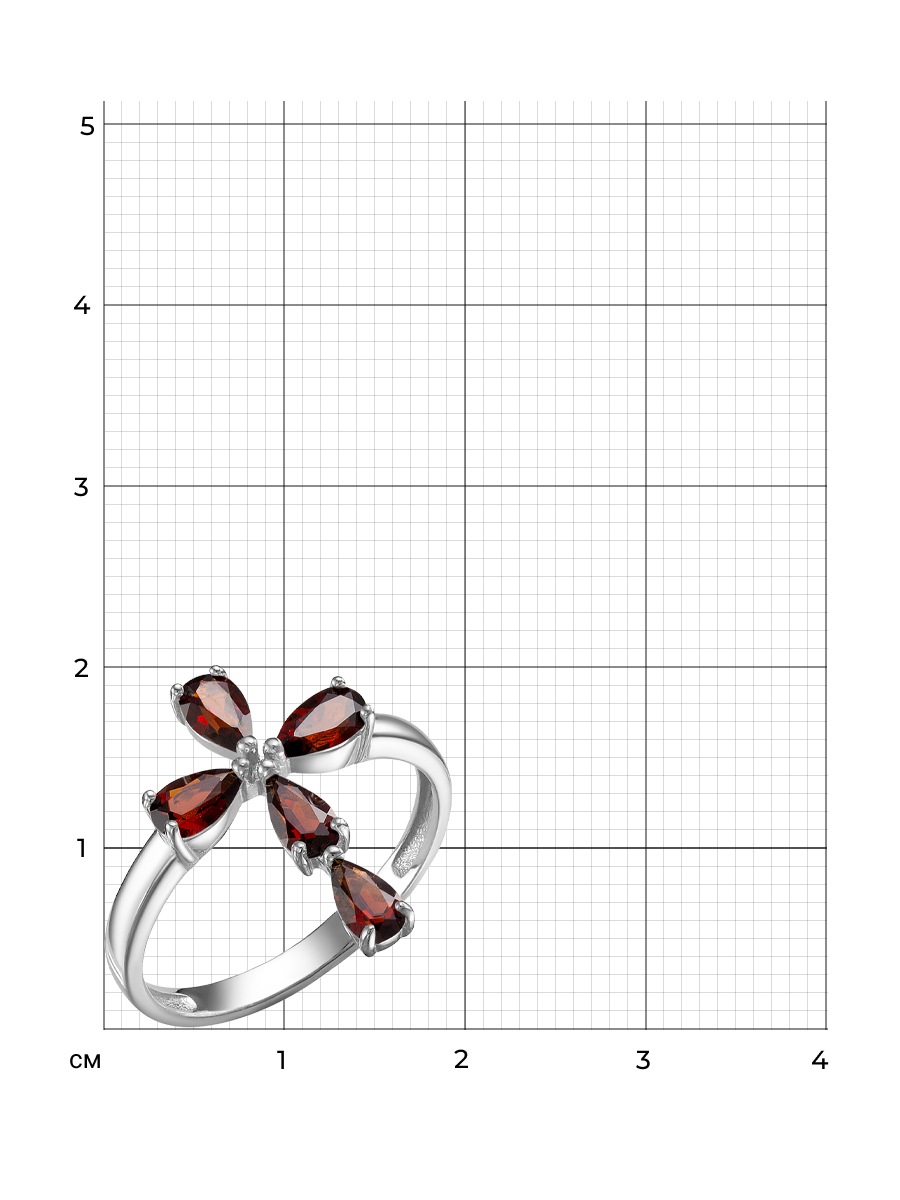 Кольцо выполнено из серебра 925 пробы с родиевым покрытием. Характеристики. Вставка 5 натуральных гранатов 5х3мм цвет гранат огранка груша. Высота декоративной части кольца 17,5мм, ширина 12мм, глубина 3мм. Ширина шинки 2,2мм. Отличным дополнением к кольцу будут серьги арт. 2-04-357-03р и подвеска арт. 3-04-357-03р. Берегите ювелирное изделие от воздействия влаги, любых спиртосодержащих растворов и жидкостей, а также парфюма. Для ухода и чистки желательно использовать специальные салфетки для серебра. Приятным дополнением к ювелирному украшению является фирменная упаковка. Значение веса и габаритов в характеристиках примерные и могут отличаться от фактических.