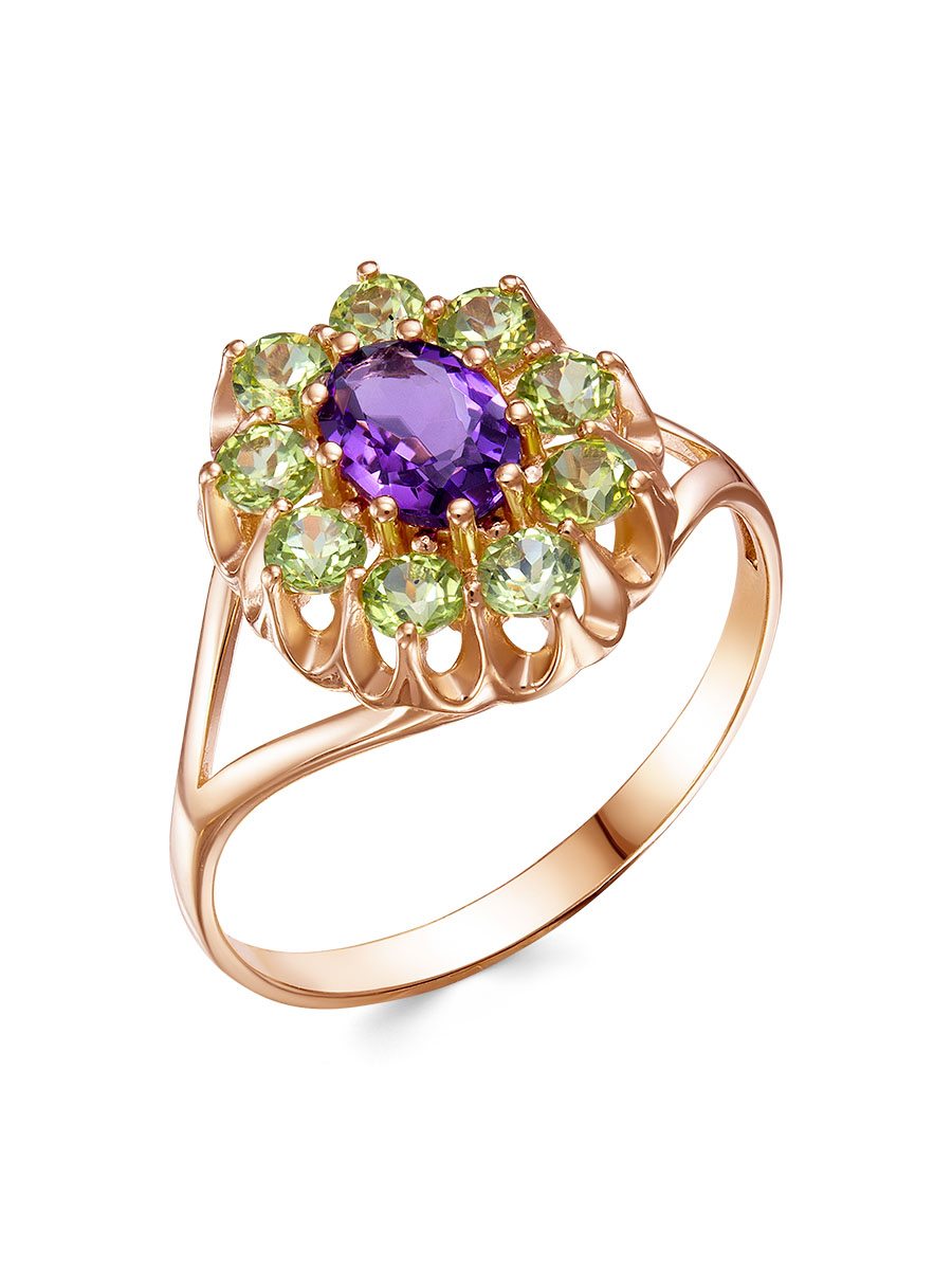 Кольцо выполнено из серебра 925 пробы с золотым покрытием. Характеристики. Вставка 1 натуральный аметист 7х5 мм цвет фиолетовый огранка овал, 9 натуральных хризолитов 3 мм цвет зелёный огранка круг. Высота декоративной части кольца 15 мм, ширина 13,5 мм, глубина 6,5 мм. Ширина шинки 2,2 мм. Отличным дополнением к кольцу будут серьги арт. 2-04-375-13з и подвеска арт. 3-04-375-13з. Берегите ювелирное изделие от воздействия влаги, любых спиртосодержащих растворов и жидкостей, а также парфюма. Для ухода и чистки желательно использовать специальные салфетки для серебра. Приятным дополнением к ювелирному украшению является фирменная упаковка. Значение веса и габаритов в характеристиках примерные и могут отличаться от фактических.