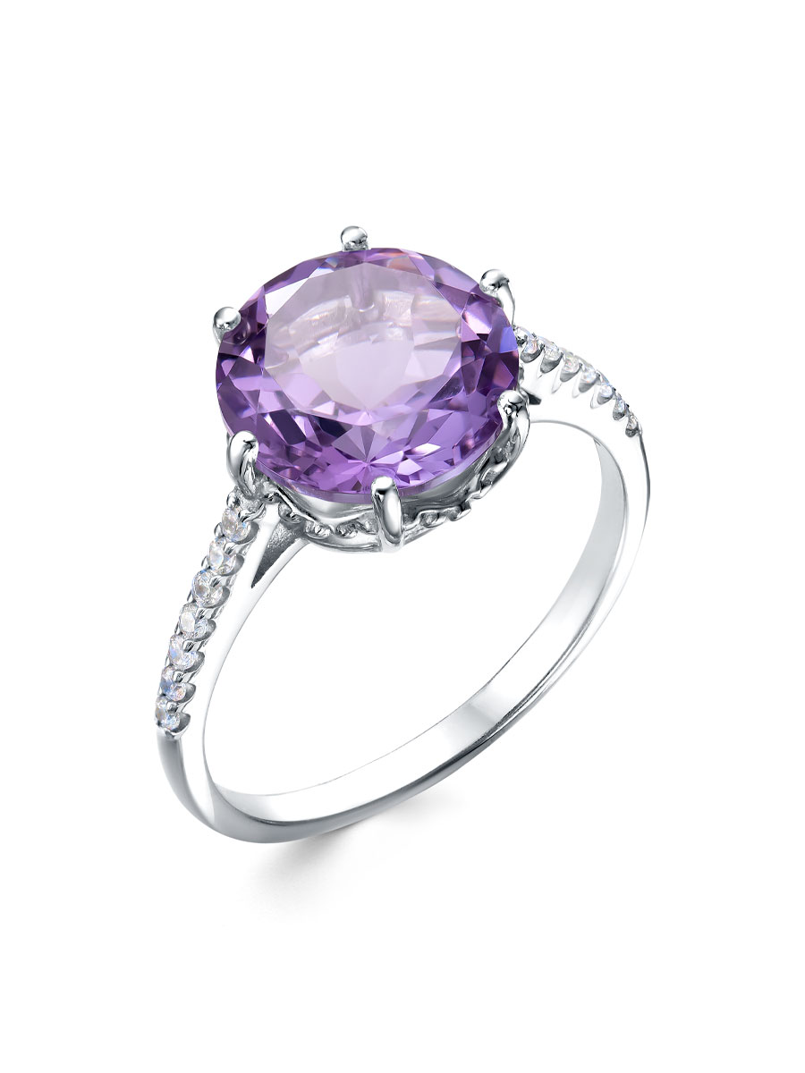 Кольцо выполнено из серебра 925 пробы с родиевым покрытием. Характеристики. Вставка 1 натуральный аметист 10 мм огранка круг, 14 недрагоценных бесцветных фианитов 1,25 мм огранка круг. Высота декоративной части кольца 10 мм, глубина 7 мм. Ширина шинки 2 мм. Отличным дополнением к кольцу будут серьги арт. 2-04-473-13р. Берегите изделие от воздействия влаги, любых спиртосодержащих растворов и жидкостей, а также парфюма. Для ухода и чистки желательно использовать специальные салфетки для серебра. Приятным дополнением к ювелирному украшению является фирменная упаковка. Значение веса и габаритов в характеристиках примерные и могут отличаться от фактических.