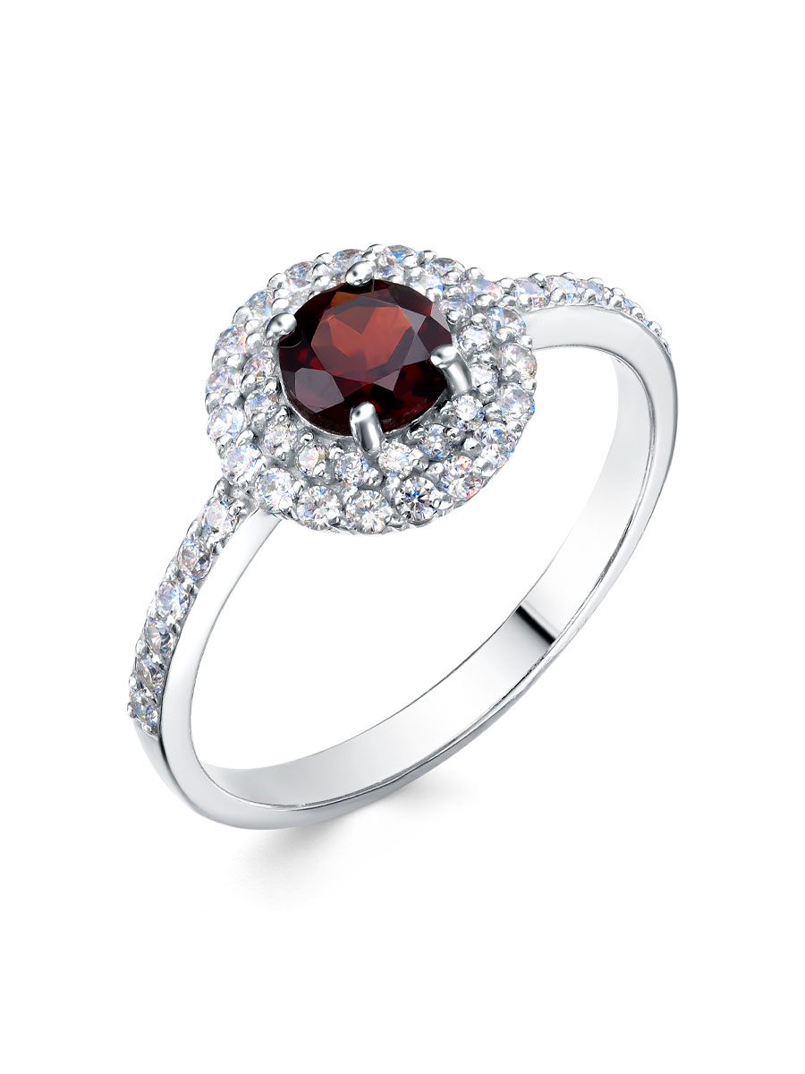 Кольцо выполнено из серебра 925 пробы с родиевым покрытием. Характеристики. Вставка 1 натуральный гранат 5 мм цвет гранат огранка круг, 31 недрагоценный бесцветный фианит 1,25 мм огранка круг, 16 недрагоценных бесцветных фианитов 1 мм огранка круг. Высота декоративной части кольца 9,7 мм. Ширина шинки 2 мм. Отличным дополнением к кольцу будут серьги арт. 2-04-474-03р. Берегите изделие от воздействия влаги, любых спиртосодержащих растворов и жидкостей, а также парфюма. Для ухода и чистки желательно использовать специальные салфетки для серебра. Приятным дополнением к ювелирному украшению является фирменная упаковка. Значение веса и габаритов в характеристиках примерные и могут отличаться от фактических.