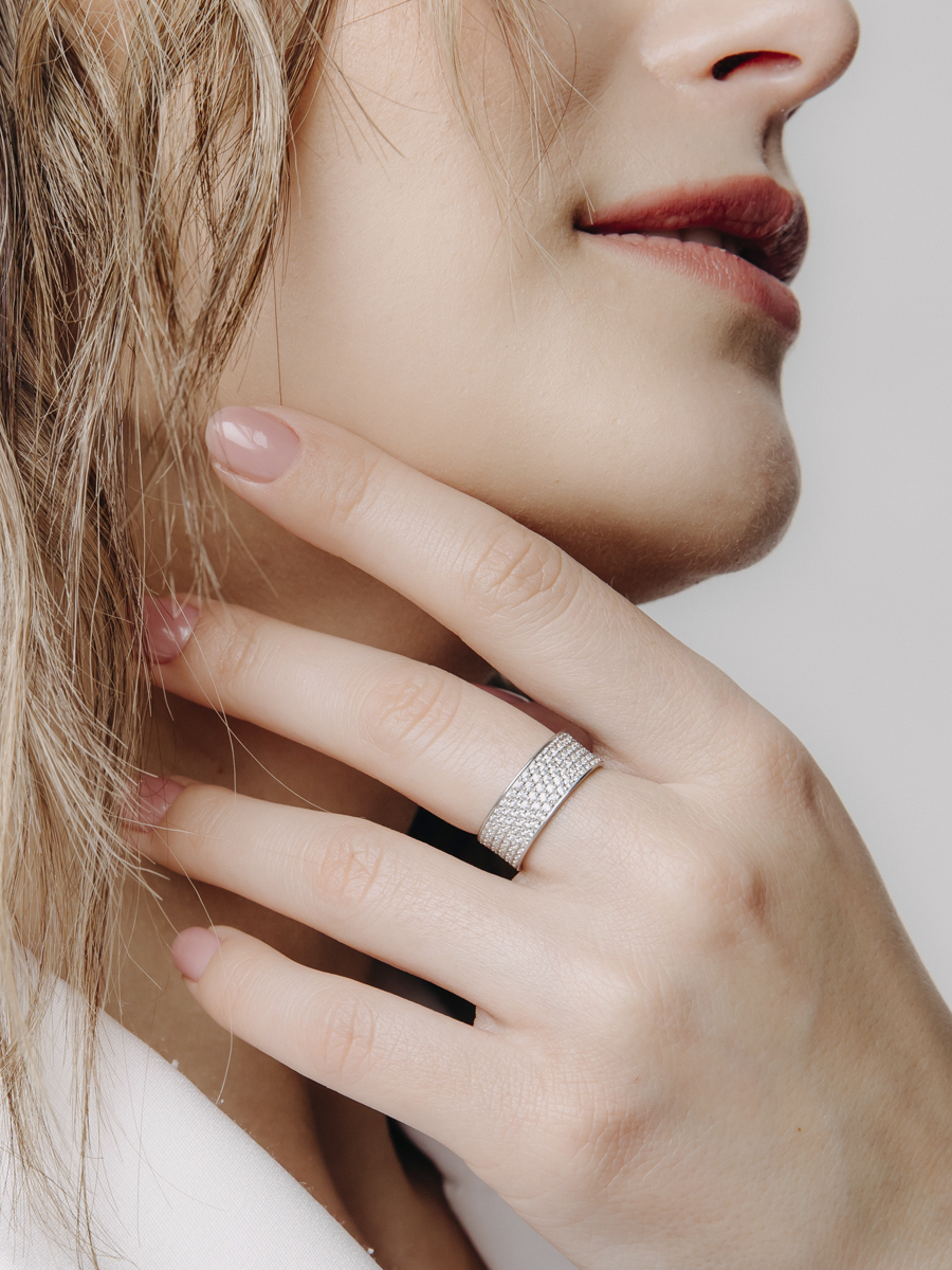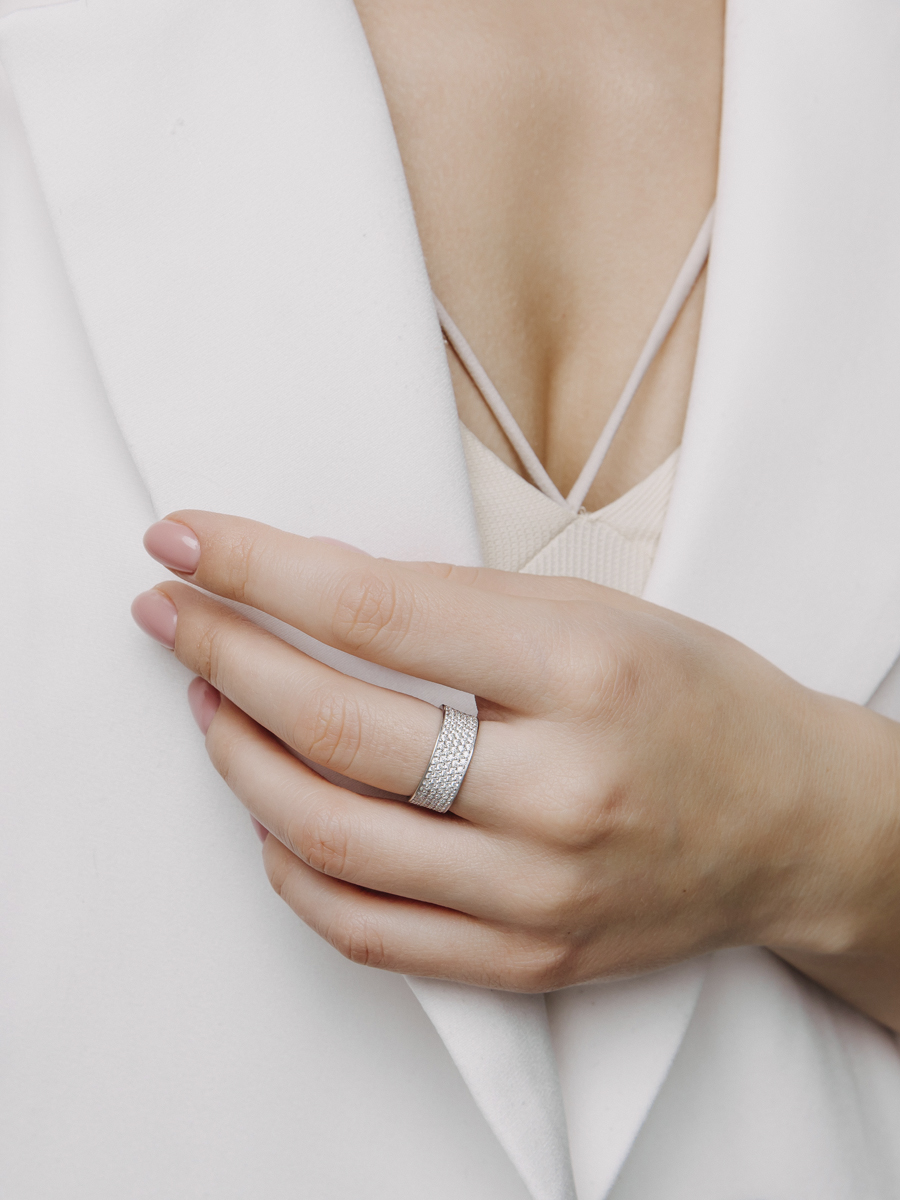 Кольцо выполнено из серебра 925 пробы с родиевым покрытием. Характеристики. Вставка 215 недрагоценных бесцветных фианитов 1,25мм огранка круг. Ширина шинки 7,5мм, глубина 1,1мм. Отличным дополнением к кольцу будут серьги арт.2-08-018-12р, браслет арт.4-08-018-12р и колье арт.5-08-018-12р. Берегите изделие от воздействия влаги, любых спиртосодержащих растворов и жидкостей, а также парфюма. Для ухода и чистки желательно использовать специальные салфетки для серебра. Приятным дополнением к ювелирному украшению является фирменная упаковка. Значение веса и габаритов в характеристиках примерные и могут отличаться от фактических.