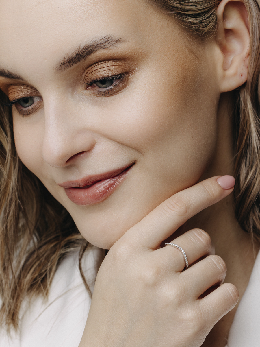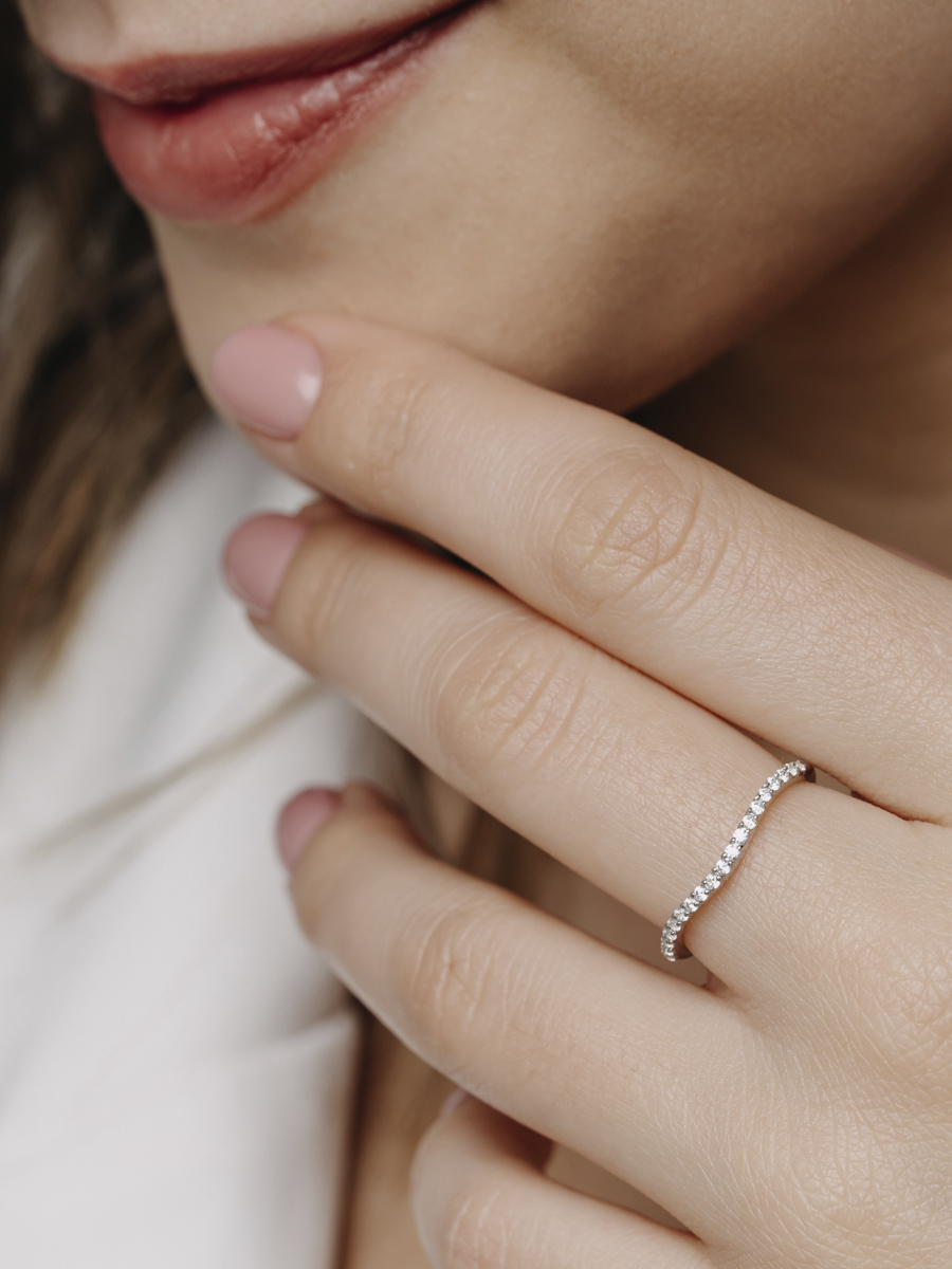 Тонкое кольцо со вставками Волна выполнено из серебра 925 пробы с родиевым покрытием. Характеристики. Вставка 19 недрагоценных бесцветных фианитов 1,25мм огранка круг. Ширина декоративной части кольца 2,4мм, глубина 1,8мм. Ширина шинки 1,3мм. Берегите изделие от воздействия влаги, любых спиртосодержащих растворов и жидкостей, а также парфюма. Для ухода и чистки желательно использовать специальные салфетки для серебра. Приятным дополнением к ювелирному украшению является фирменная упаковка. Значение веса и габаритов в характеристиках примерные и могут отличаться от фактических.
