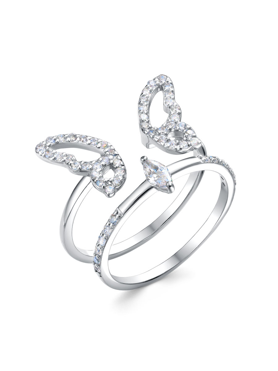 Кольцо выполнено из серебра 925 пробы с родиевым покрытием. Характеристики. Вставка 1 недрагоценный бесцветный фианит 5х2,5 мм огранка маркиз, 14 недрагоценных бесцветных фианитов 1,25 мм огранка круг, 40 недрагоценных бесцветных фианитов 1 мм огранка круг. Высота бабочки 11 мм, ширина 18 мм, ширина крыла 7,2 мм, ширина шинки 1,5 мм. Высота второго кольца 5,8 мм, ширина шинки 1,5 мм. Берегите изделие от воздействия влаги, любых спиртосодержащих растворов и жидкостей, а также парфюма. Для ухода и чистки желательно использовать специальные салфетки для серебра. Приятным дополнением к ювелирному украшению является фирменная упаковка. Значение веса и габаритов в характеристиках примерные и могут отличаться от фактических.