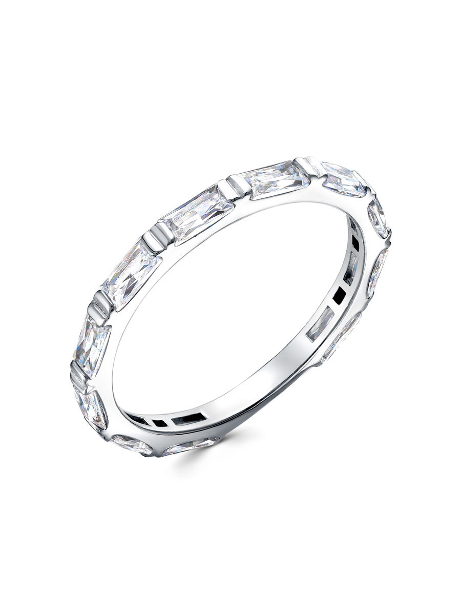 Кольцо выполнено из серебра 925 пробы с родиевым покрытием. Характеристики. Вставка недрагоценные бесцветные фианиты 4х2 мм огранка багет. Ширина кольца 2 мм, глубина вместе с камнями 2 мм. Берегите изделие от воздействия влаги, любых спиртосодержащих растворов и жидкостей, а также парфюма. Для ухода и чистки желательно использовать специальные салфетки для серебра. Приятным дополнением к ювелирному украшению является фирменная упаковка. Значение веса и габаритов в характеристиках примерные и могут отличаться от фактических.