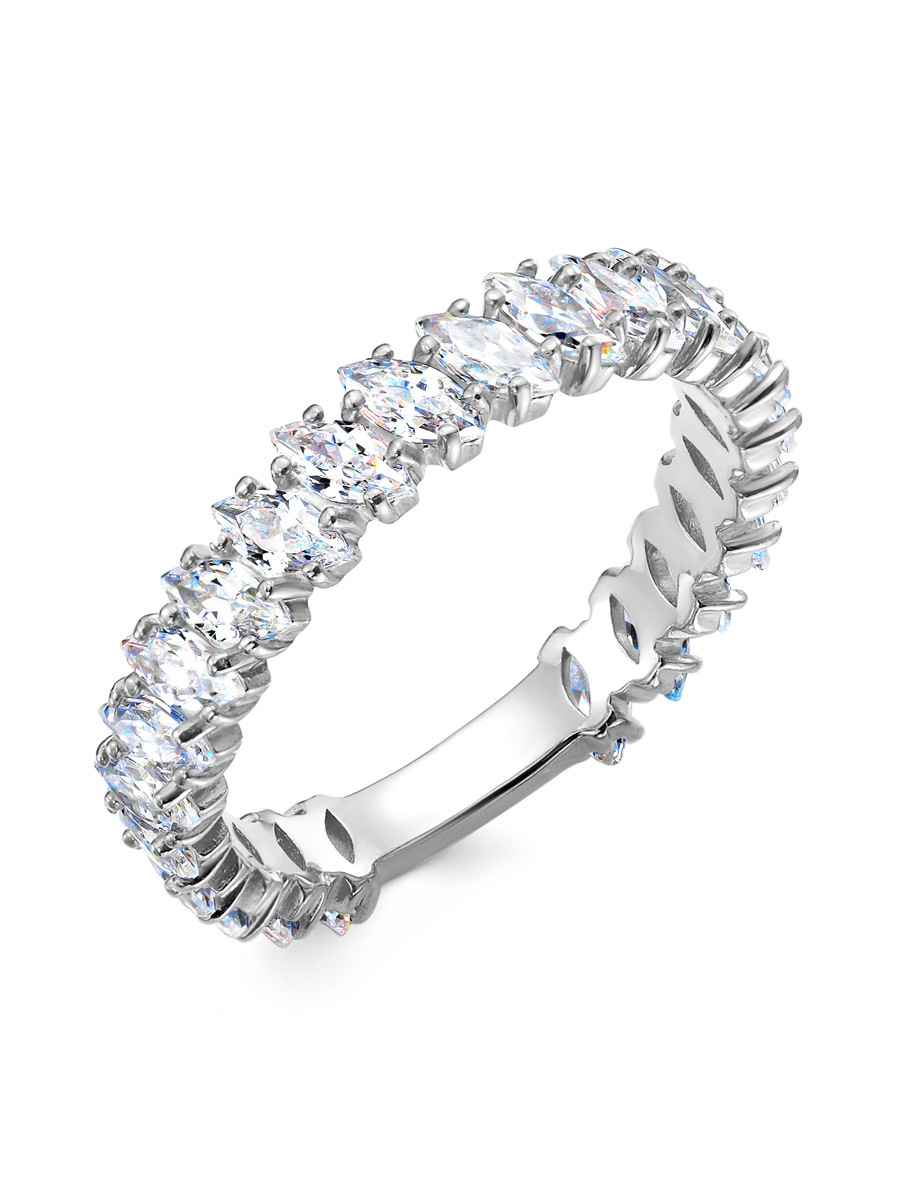 Кольцо выполнено из серебра 925 пробы с родиевым покрытием. Характеристики. Вставка 23 недрагоценных бесцветных фианита 4х2 мм огранка маркиз. Высота декоративной части кольца 3,8 мм. Ширина шинки 2,5 мм. Берегите изделие от воздействия влаги, любых спиртосодержащих растворов и жидкостей, а также парфюма. Для ухода и чистки желательно использовать специальные салфетки для серебра. Приятным дополнением к ювелирному украшению является фирменная упаковка. Значение веса и габаритов в характеристиках примерные и могут отличаться от фактических.