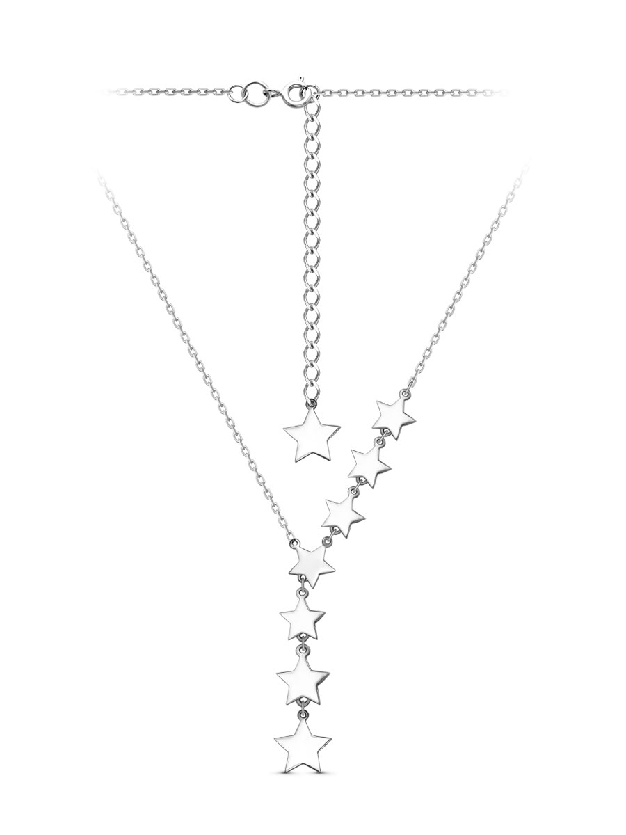 Колье выполнено из серебра 925 пробы с родиевым покрытием. Характеристики. Высота подвесной части из 4 звёзд 40 мм. Ширина самой большой звёздочки 10,6 мм. Толщина цепочки 1,4 мм. Замок шпрингельный. Есть возможность удлинить колье на 50 мм. Берегите изделие от воздействия влаги, любых спиртосодержащих растворов и жидкостей, а также парфюма. Для ухода и чистки желательно использовать специальные салфетки для серебра. Приятным дополнением к ювелирному украшению является фирменная упаковка. Значение веса и габаритов в характеристиках примерные и могут отличаться от фактических.