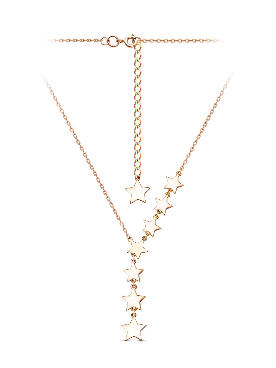 Колье выполнено из серебра 925 пробы с золотым покрытием. Характеристики. Высота подвесной части из 4 звёзд 40 мм. Ширина самой большой звёздочки 10,6 мм. Толщина цепочки 1,4 мм. Замок шпрингельный. Есть возможность удлинить колье на 50 мм. Берегите изделие от воздействия влаги, любых спиртосодержащих растворов и жидкостей, а также парфюма. Для ухода и чистки желательно использовать специальные салфетки для серебра. Приятным дополнением к ювелирному украшению является фирменная упаковка. Значение веса и габаритов в характеристиках примерные и могут отличаться от фактических.