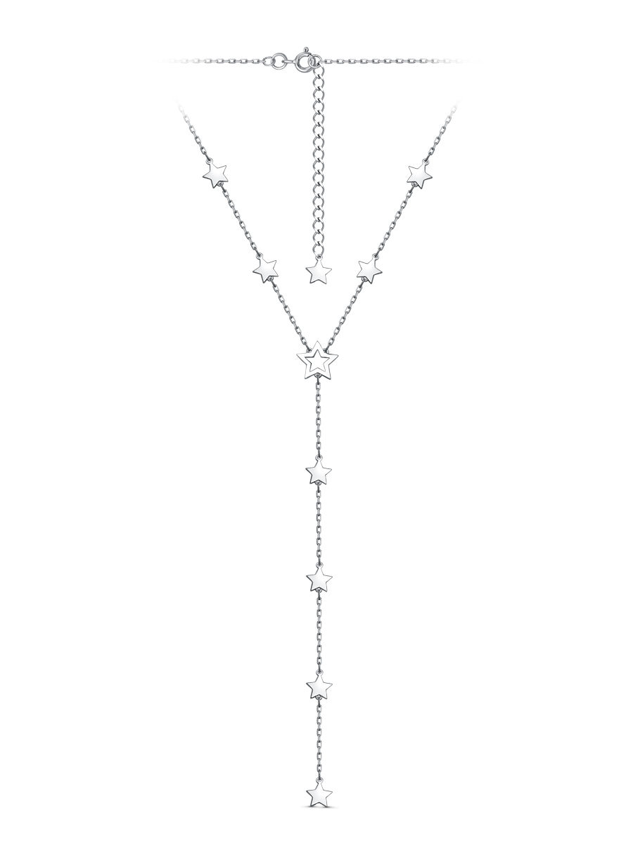 Колье выполнено из серебра 925 пробы с родиевым покрытием. Характеристики. Высота подвесной части вместе с большой звездой 120 мм. Высота центральной звезды 10,5 мм. Диаметр маленьких звёздочек 7 мм, высота вместе с колечком 8 мм. Длина цепочек между звёздами 17 мм. Есть возможность удлинить колье на 50 мм. Замок шпрингельный. Берегите изделие от воздействия влаги, любых спиртосодержащих растворов и жидкостей, а также парфюма. Для ухода и чистки желательно использовать специальные салфетки для серебра. Приятным дополнением к ювелирному украшению является фирменная упаковка. Значение веса и габаритов в характеристиках примерные и могут отличаться от фактических.
