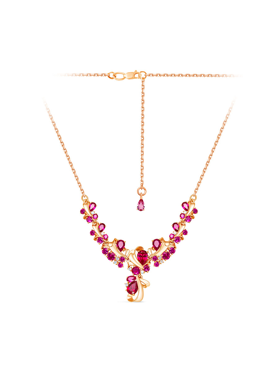 Элегантное колье выполнено из серебра 925 пробы с золотым покрытием. Характеристики. Вставка 2 корунд рубина 7х5мм цвет красный огранка груша, 2 корунд рубина 6х4мм цвет красный огранка груша, 6 корунд рубинов 5х3мм цвет красный огранка груша, 3 корунд рубина 4мм цвет красный огранка круг, недрагоценные фианиты. Высота центральной части 27мм, высота подвесной части 13,5мм. Замок карабин. Есть возможность увеличить размер колье на 50мм. Отличным дополнением к колье будут кольцо арт.1-04-123-02з и серьги арт.2-04-123-02з. Берегите изделие от воздействия влаги, любых спиртосодержащих растворов и жидкостей, а также парфюма. Для ухода и чистки желательно использовать специальные салфетки для серебра. Приятным дополнением к ювелирному украшению является фирменная упаковка. Значение веса в характеристиках примерное и может отличаться от фактического.