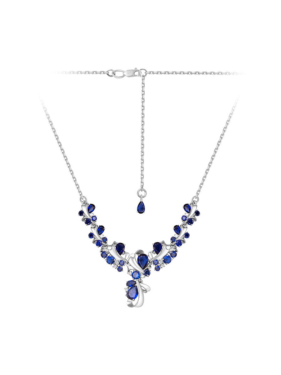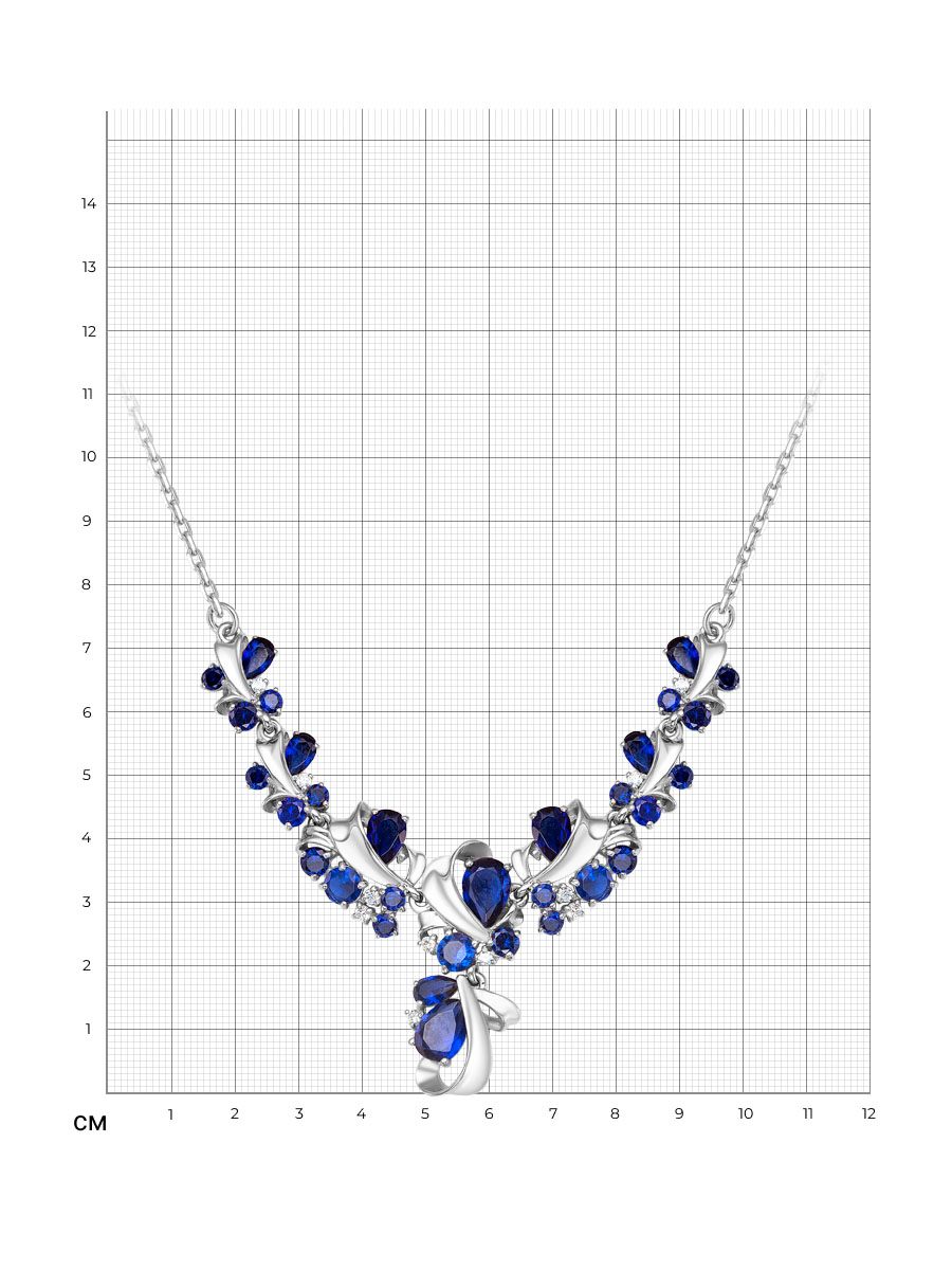 Элегантное колье выполнено из серебра 925 пробы с родиевым покрытием. Характеристики. Вставка 2 плавленых кварца7х5мм цвет сапфир огранка груша, 2 плавленых кварца 6х4мм цвет сапфир огранка груша, 6 плавленых кварцев 5х3мм цвет сапфир огранка груша, 3 плавленых кварца 4мм цвет сапфир огранка круг, 7 плавленых кварцев3мм цвет сапфир огранка круг. Высота центральной части 27мм, высота подвесной части 13,5мм. Замок карабин. Есть возможность увеличить размер колье на 50мм. Отличным дополнением к колье будут кольцо арт.1-06-123-01р и серьги арт.2-06-123-01р. Берегите изделие от воздействия влаги, любых спиртосодержащих растворов и жидкостей, а также парфюма. Для ухода и чистки желательно использовать специальные салфетки для серебра. Приятным дополнением к ювелирному украшению является фирменная упаковка. Значение веса в характеристиках примерное и может отличаться от фактического.