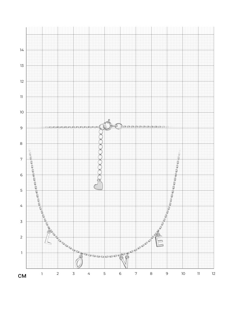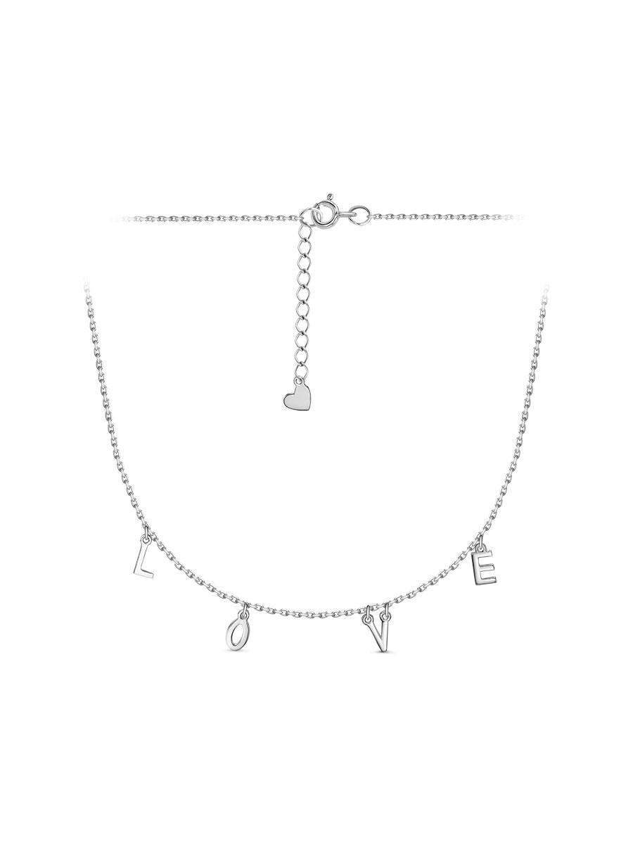 Колье LOVE выполнено из серебра 925 пробы с родиевым покрытием. Характеристики. Ширина декоративной части колье 60мм. Высота буквы L 8,5мм, ширина 4мм, буквы O 8,5мм, ширина 4,5мм, буквы V 8,5мм, ширина 6мм, буквы E 8,5мм, ширина 4мм. Есть возможность удлинить колье на 50мм. Замок шпрингельный. Отличным дополнением к колье будет браслет арт.7-070-1р. Берегите изделие от воздействия влаги, любых спиртосодержащих растворов и жидкостей, а также парфюма. Для ухода и чистки желательно использовать специальные салфетки для серебра. Приятным дополнением к ювелирному украшению является фирменная упаковка. Значение веса и габаритов в характеристиках примерные и могут отличаться от фактических.