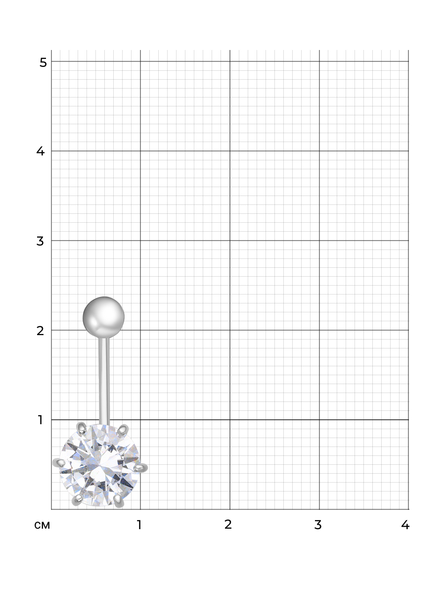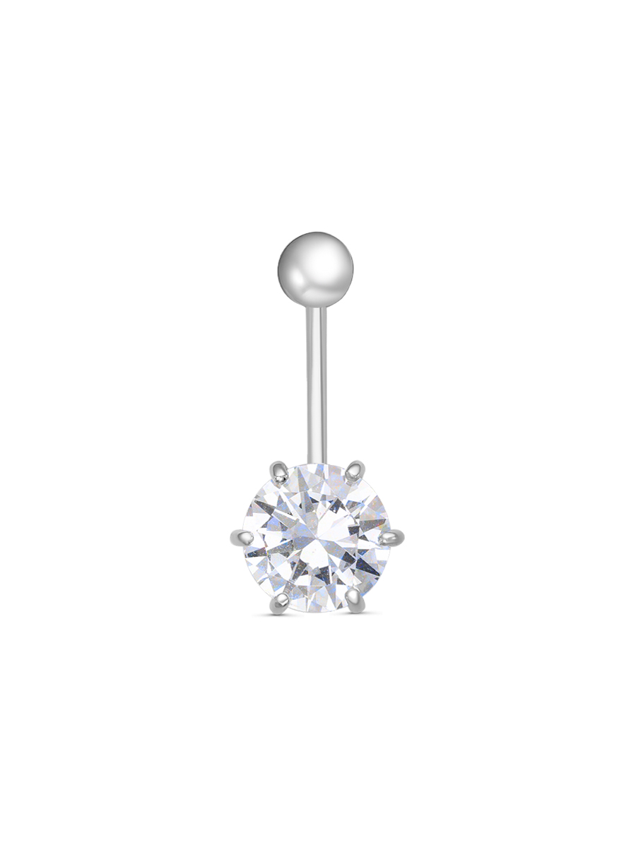 Пирсинг для пупка из серебра 925 пробы с родиевым покрытием. Характеристики. Вставка недрагоценный бесцветный фианит 9 мм огранка круг. Общая высота пирсинга 25 мм, глубина декоративной части 4,5 мм. Рабочая длина штанги 11 мм, диаметр штанги 1,2 мм. Диаметр закручивающегося шарика 4,5 мм. Берегите изделие от воздействия влаги, любых спиртосодержащих растворов и жидкостей, а также парфюма. Для ухода и чистки желательно использовать специальные салфетки для серебра. Приятным дополнением к украшению является фирменная упаковка. Значение веса в характеристиках является примерным и может отличаться от фактического.