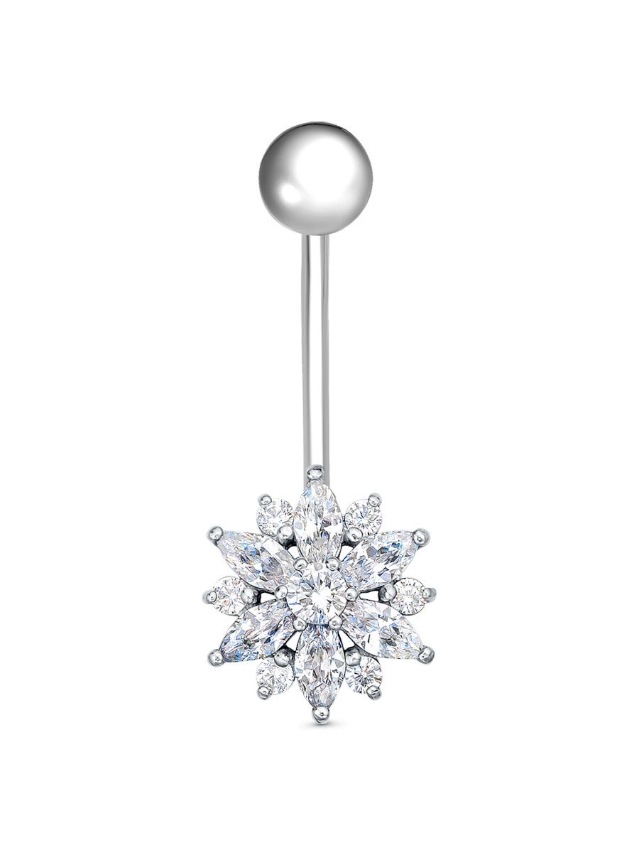 Пирсинг для пупка из серебра 925 пробы с родиевым покрытием. Характеристики. Вставка 6 недрагоценных бесцветных фианитов 4х2 мм огранка маркиз, 6 недрагоценных бесцветных фианитов 1,5 мм огранка круг, 1 недрагоценный бесцветный фианит 2,5 мм огранка круг. Высота пирсинга 25 мм, высота декоративной части 10,3 мм, ширина 9,7 мм, глубина 3 мм. Рабочая высота штанги 12 мм, толщина 1,2 мм. Диаметр закручивающегося шарика 4,5 мм. Отличным дополнением к пирсингу будут серьги арт. 2-08-288-12з. Берегите изделие от воздействия влаги, любых спиртосодержащих растворов и жидкостей, а также парфюма. Для ухода и чистки желательно использовать специальные салфетки для серебра. Приятным дополнением к украшению является фирменная упаковка. Значение веса и габаритов в характеристиках примерные и могут отличаться от фактических.