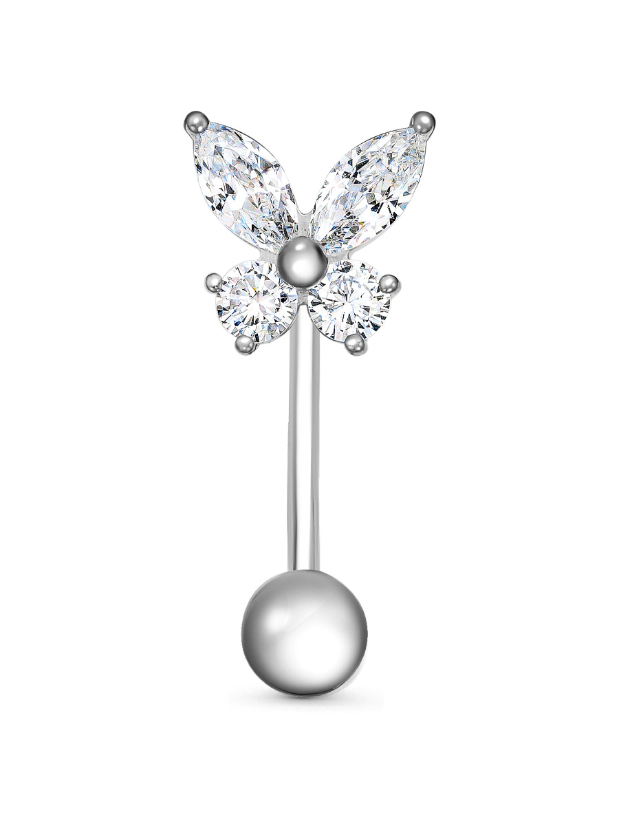 Пирсинг для пупка из серебра 925 пробы с родиевым покрытием. Характеристики. Вставка 2 недрагоценных бесцветных фианита 6х3 мм огранка маркиз, 2 недрагоценных бесцветных фианита 3 мм огранка круг. Общая высота пирсинга 21,5 мм. Высота декоративной части 9,2 мм, ширина 9,2 мм. Рабочая высота штанги 14 мм, толщина 1,3 мм. Диаметр завинчивающегося шарика 4,5 мм. Берегите изделие от воздействия влаги, любых спиртосодержащих растворов и жидкостей, а также парфюма. Для ухода и чистки желательно использовать специальные салфетки для серебра. Приятным дополнением к украшению является фирменная упаковка. Значение веса и габаритов в характеристиках примерные и могут отличаться от фактических.