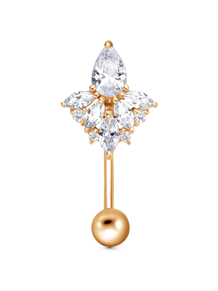 Пирсинг для пупка из серебра 925 пробы с золотым покрытием. Характеристики. Вставка 1 недрагоценный бесцветный фианит 6х4 мм огранка груша, 1 недрагоценный бесцветный фианит 5х2,5 мм огранка маркиз, 4 недрагоценных бесцветных фианита 4х2 мм огранка маркиз, 2 недрагоценных бесцветных фианита 1,5 мм огранка круг, 2 недрагоценных бесцветных фианита 1,25 мм огранка круг. Общая высота пирсинга 25 мм. Высота декоративной части 13,8 мм, ширина 11,2 мм. Рабочая высота штанги 16 мм, толщина 1,2 мм. Диаметр завинчивающегося шарика 4,5 мм. Берегите изделие от воздействия влаги, любых спиртосодержащих растворов и жидкостей, а также парфюма. Для ухода и чистки желательно использовать специальные салфетки для серебра. Приятным дополнением к украшению является фирменная упаковка. Значение веса и габаритов в характеристиках примерные и могут отличаться от фактических.