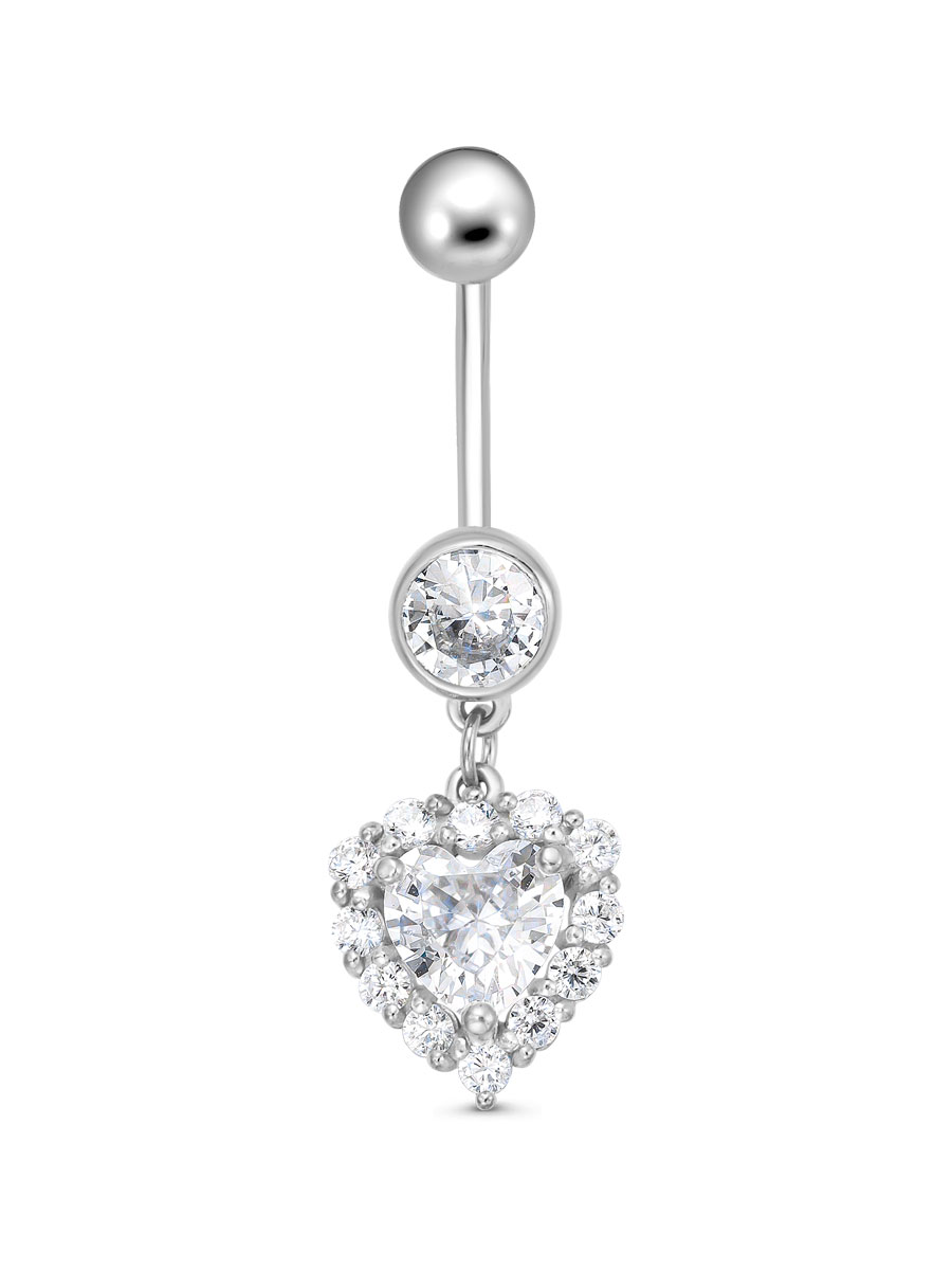 Пирсинг для пупка из серебра 925 пробы с родиевым покрытием. Характеристики. Вставка 1 недрагоценный бесцветный фианит 6х6 мм огранка сердце, 1 недрагоценный бесцветный фианит 5 мм огранка круг, 12 недрагоценных бесцветных фианитов 1,75 мм огранка круг. Общая высота пирсинга 33 мм. Высота подвесного сердечка 10,8 мм, ширина 9,8 мм. Рабочая высота штанги 14 мм, толщина 1,2 мм. Диаметр закручивающегося шарика 4,5 мм. Берегите изделие от воздействия влаги, любых спиртосодержащих растворов и жидкостей, а также парфюма. Для ухода и чистки желательно использовать специальные салфетки для серебра. Приятным дополнением к украшению является фирменная упаковка. Значение веса и габаритов в характеристиках примерные и могут отличаться от фактических.