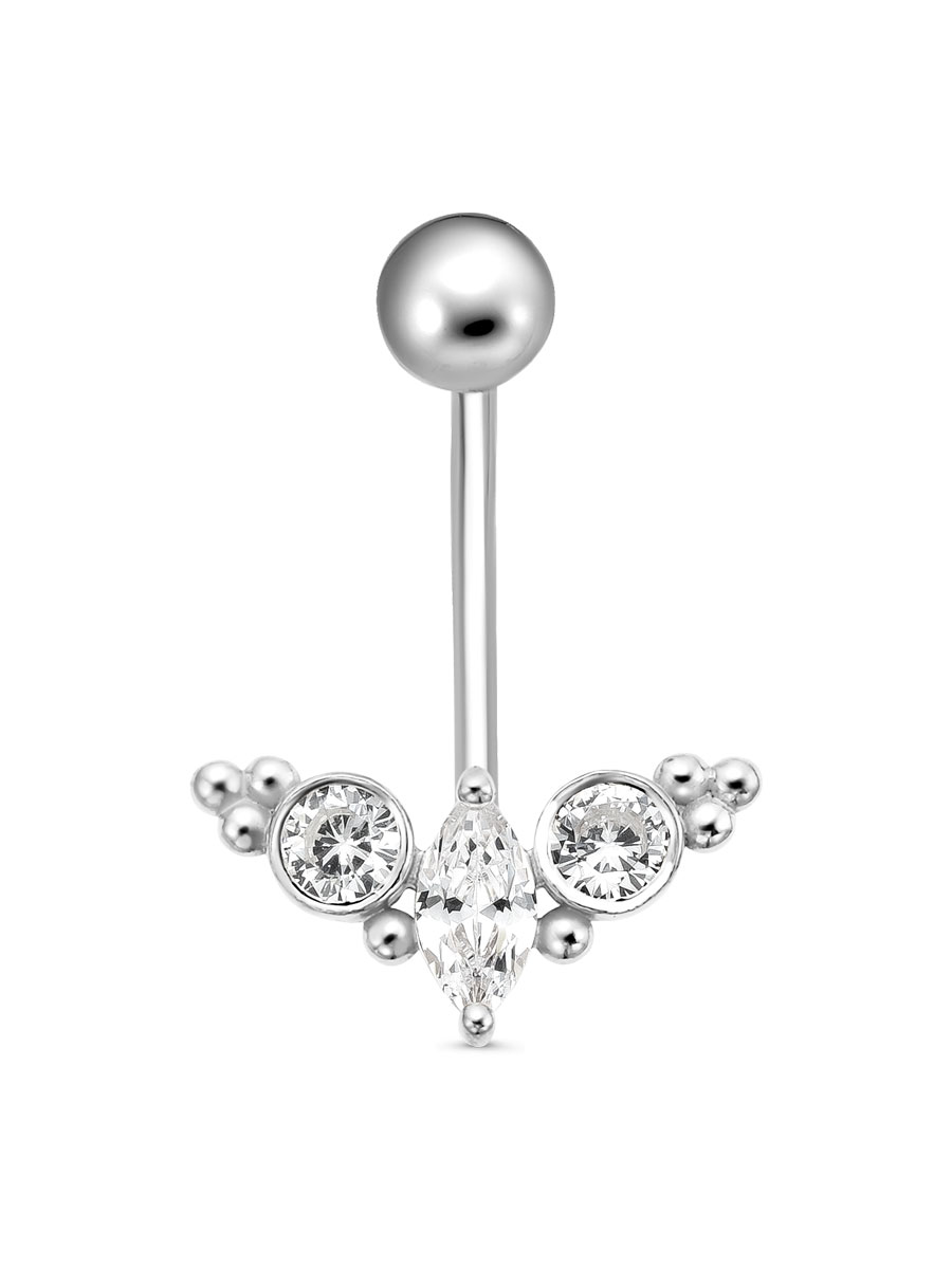 Пирсинг для пупка из серебра 925 пробы с родиевым покрытием. Характеристики. Вставка 21 недрагоценный бесцветный фианит 1,5 мм огранка круг. Общая высота пирсинга 21,3 мм. Высота декоративной части 7,5 мм, ширина 14,3 мм. Рабочая длина штанги 13 мм, толщина 1,2 мм. Диаметр завинчивающегося шарика 4,5 мм. Берегите изделие от воздействия влаги, любых спиртосодержащих растворов и жидкостей, а также парфюма. Для ухода и чистки желательно использовать специальные салфетки для серебра. Приятным дополнением к украшению является фирменная упаковка. Значение веса и габаритов в характеристиках примерные и могут отличаться от фактических.