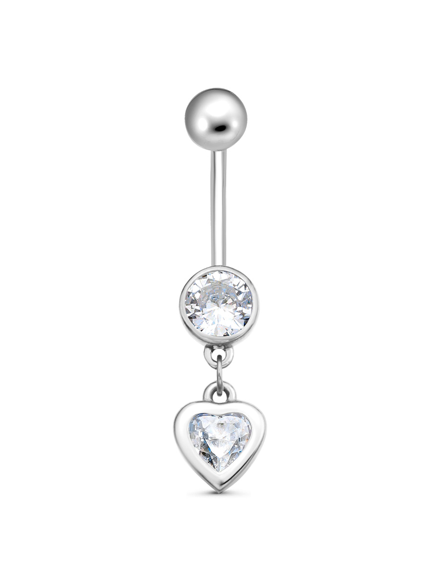 Пирсинг для пупка из серебра 925 пробы с родиевым покрытием. Характеристики. Вставка 1 недрагоценный бесцветный фианит 5х5 мм огранка сердце, 1 недрагоценный бесцветный фианит 5 мм огранка круг. Общая высота пирсинга 29 мм. Высота подвесного сердечка без учёта соединительного колечка 7 мм, ширина 6,7 мм. Рабочая длина штанги 13 мм, толщина 1,2 мм. Диаметр закручивающегося шарика 4,5 мм. Берегите изделие от воздействия влаги, любых спиртосодержащих растворов и жидкостей, а также парфюма. Для ухода и чистки желательно использовать специальные салфетки для серебра. Приятным дополнением к украшению является фирменная упаковка. Значение веса и габаритов в характеристиках примерные и могут отличаться от фактических.