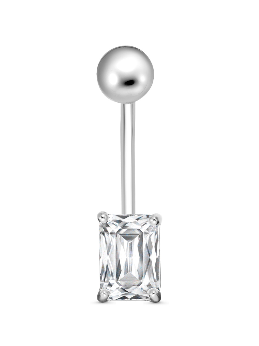 Пирсинг для пупка из серебра 925 пробы с родиевым покрытием. Характеристики. Вставка 1 недрагоценный бесцветный фианит 7х5 мм огранка октагон. Высота пирсинга 21,2 мм, высота декоративной части 7,5 мм, ширина 5,3 мм. Рабочая высота штанги 12 мм, толщина 1,3 мм. Диаметр закручивающегося шарика 4,5 мм. Берегите изделие от воздействия влаги, любых спиртосодержащих растворов и жидкостей, а также парфюма. Для ухода и чистки желательно использовать специальные салфетки для серебра. Приятным дополнением к украшению является фирменная упаковка. Значение веса и габаритов в характеристиках примерные и могут отличаться от фактических.