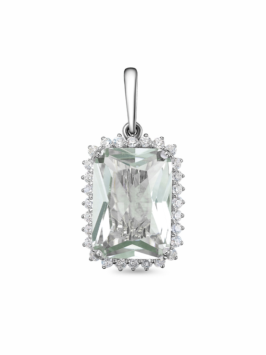 Подвеска выполнена из серебра 925 пробы с родиевым покрытием. Характеристики. Вставка 1 натуральный празиолит 14х10 мм огранка октагон, 28 недрагоценных бесцветных фианитов 1,5 мм огранка круг. Общая высота подвески 26 мм, высота подвесной части 19 мм, ширина 13 мм. Внутренняя высота ушка 6 мм, ширина 3,5 мм. Отличным дополнением к подвеске будут кольцо арт.1-04-256-21р и серьги арт.2-04-256-21р. Берегите изделие от воздействия влаги, любых спиртосодержащих растворов и жидкостей, а также парфюма. Для ухода и чистки желательно использовать специальные салфетки для серебра. Приятным дополнением к украшению является фирменная упаковка. Значения веса и габаритов в характеристиках примерные и могут отличаться от фактических.