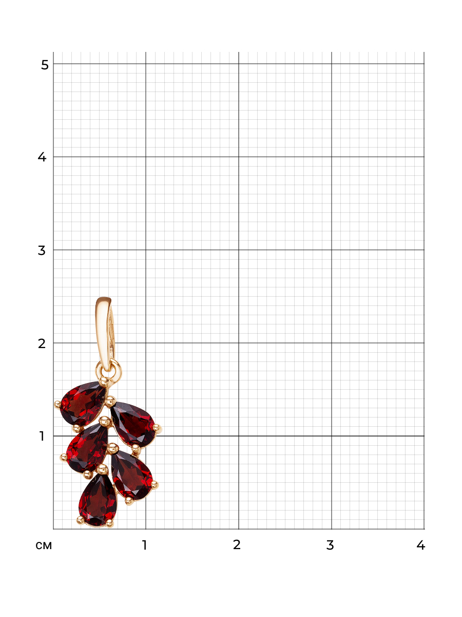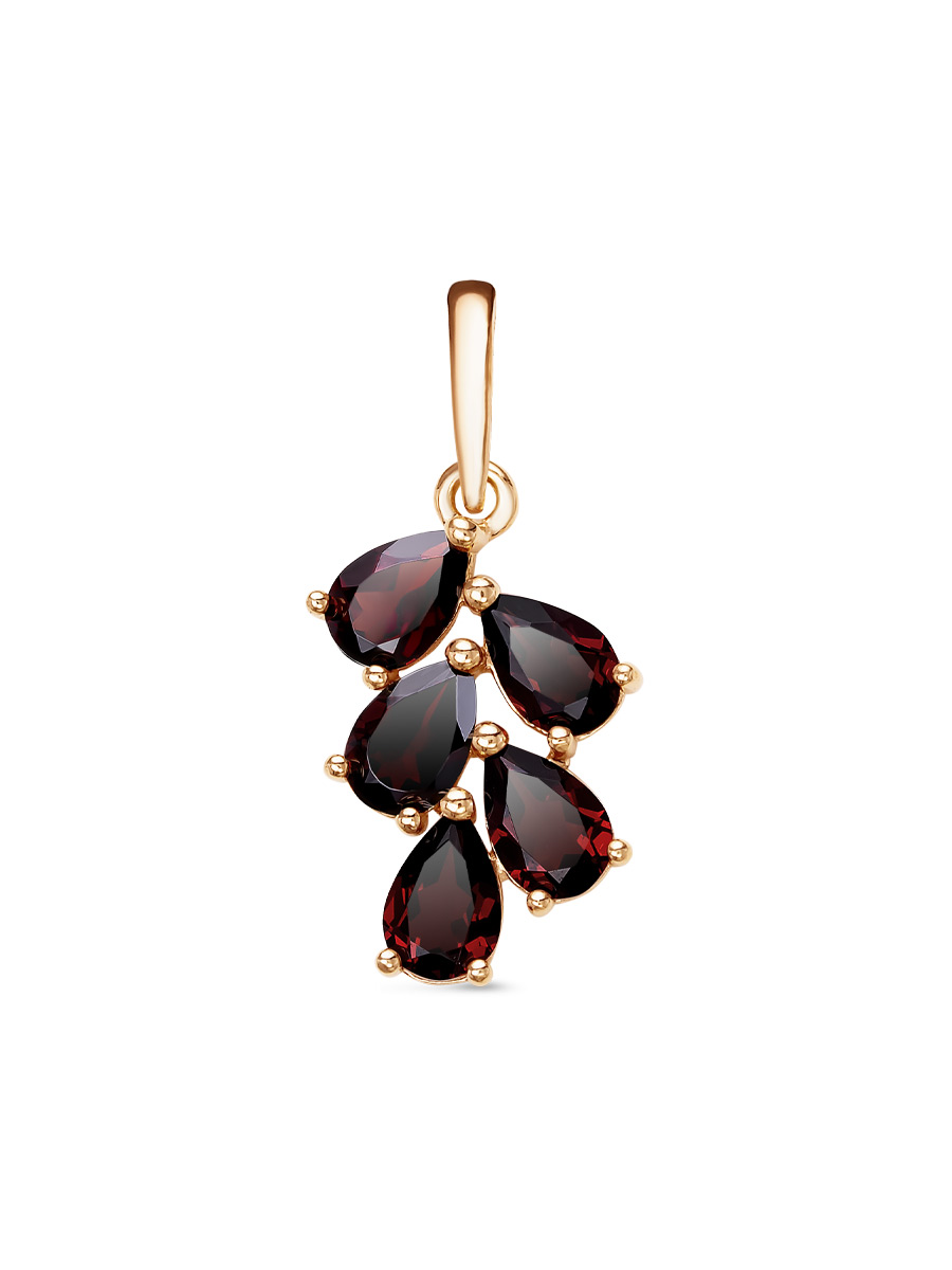 Подвеска выполнена из серебра 925 пробы с золотым покрытием. Характеристики. Вставка 5 натуральных гранатов 6х4мм цвет гранат огранка груша. Общая высота подвески 25мм, высота подвесной части 17,5мм, ширина 11,3мм. Внутренняя высота ушка 5,5мм, ширина 3,4мм. Отличным дополнением к подвеске будут серьги арт. 2-04-340-03з. Берегите изделие от воздействия влаги, любых спиртосодержащих растворов и жидкостей, а также парфюма. Для ухода и чистки желательно использовать специальные салфетки для серебра. Приятным дополнением к ювелирному украшению является фирменная упаковка. Значение веса и габаритов в характеристиках примерные и могут отличаться от фактических.