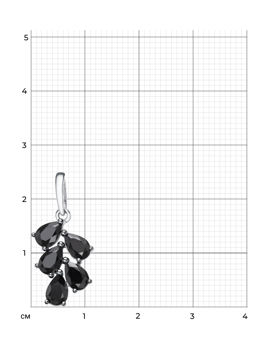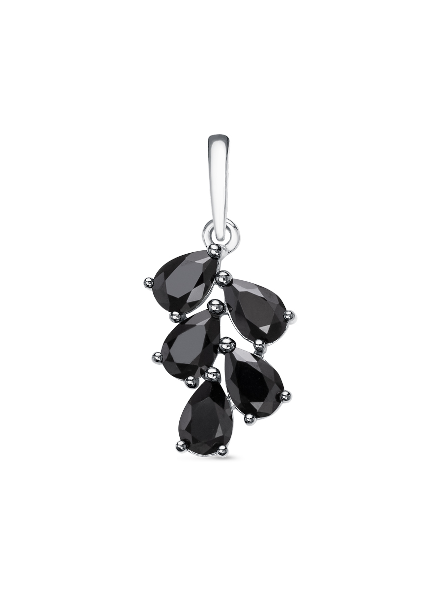 Подвеска выполнена из серебра 925 пробы с родиевым покрытием. Характеристики. Вставка 5 натуральных шпинелей 6х4мм цвет чёрный огранка груша. Общая высота подвески 25мм, высота подвесной части 17,5мм, ширина 11,3мм. Внутренняя высота ушка 5,5мм, ширина 3,4мм. Отличным дополнением к подвеске будут серьги арт. 2-04-340-11р. Берегите изделие от воздействия влаги, любых спиртосодержащих растворов и жидкостей, а также парфюма. Для ухода и чистки желательно использовать специальные салфетки для серебра. Приятным дополнением к ювелирному украшению является фирменная упаковка. Значение веса и габаритов в характеристиках примерные и могут отличаться от фактических.