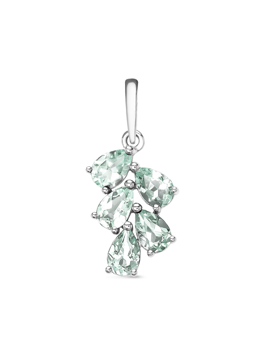 Подвеска выполнена из серебра 925 пробы с родиевым покрытием. Характеристики. Вставка 5 натуральных празиолитов 6х4 мм огранка груша. Общая высота подвески 25 мм, высота подвесной части 17,5 мм, ширина 11,3 мм. Внутренняя высота ушка 5,5 мм, ширина 3,5 мм. Отличным дополнением к подвеске будут серьги арт. 2-04-340-21р. Берегите изделие от воздействия влаги, любых спиртосодержащих растворов и жидкостей, а также парфюма. Для ухода и чистки желательно использовать специальные салфетки для серебра. Приятным дополнением к ювелирному украшению является фирменная упаковка. Значение веса и габаритов в характеристиках примерные и могут отличаться от фактических.
