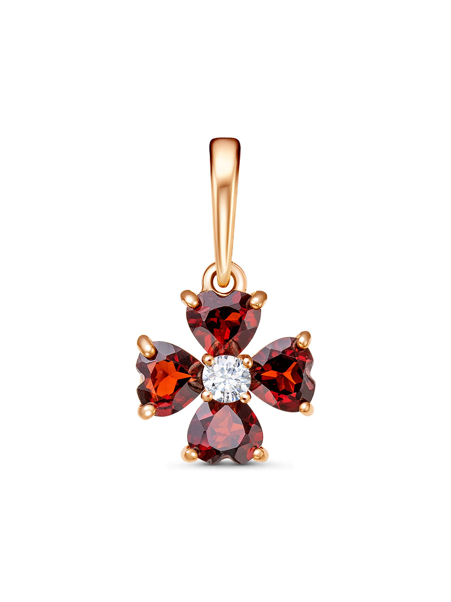 Подвеска выполнена из серебра 925 пробы с золотым покрытием. Характеристики. Вставка 4 натуральных граната 4х4 мм цвет гранат огранка сердце, 1 недрагоценный бесцветный фианит 2,5 мм огранка круг. Общая высота подвески 17,5 мм, высота подвесной части вместе с колечком 10,5 мм, ширина 9,5 мм, глубина 4,2 мм. Внутренняя высота ушка 6 мм, ширина 3,7 мм. Отличным дополнением к подвеске будут серьги арт.2-04-422-03з. Берегите изделие от воздействия влаги, любых спиртосодержащих растворов и жидкостей, а также парфюма. Для ухода и чистки желательно использовать специальные салфетки для серебра. Приятным дополнением к ювелирному украшению является фирменная упаковка. Значение веса и габаритов в характеристиках примерные и могут отличаться от фактических.