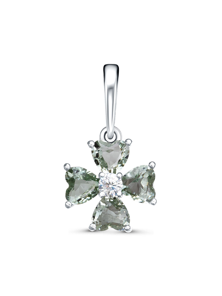 Подвеска выполнена из серебра 925 пробы с родиевым покрытием. Характеристики. Вставка 4 натуральных празиолита 4х4 мм огранка сердце, 1 недрагоценный бесцветный фианит 2,5 мм огранка круг. Общая высота подвески 17,5 мм, высота подвесной части вместе с колечком 10,5 мм, ширина 9,5 мм, глубина 4,2 мм. Внутренняя высота ушка 6 мм, ширина 3,7 мм. Отличным дополнением к подвеске будут пусеты арт. 2-04-422-21рП. Берегите изделие от воздействия влаги, любых спиртосодержащих растворов и жидкостей, а также парфюма. Для ухода и чистки желательно использовать специальные салфетки для серебра. Приятным дополнением к ювелирному украшению является фирменная упаковка. Значение веса и габаритов в характеристиках примерные и могут отличаться от фактических.