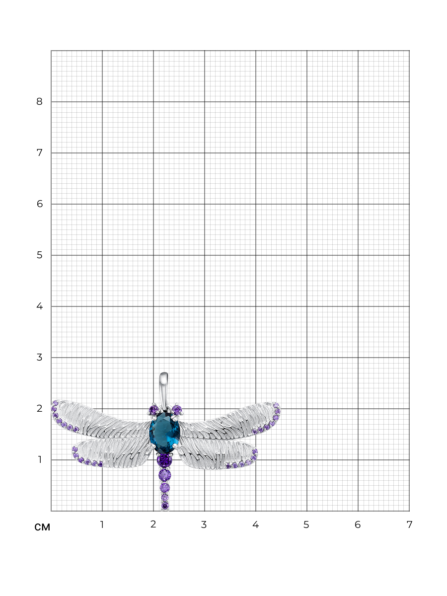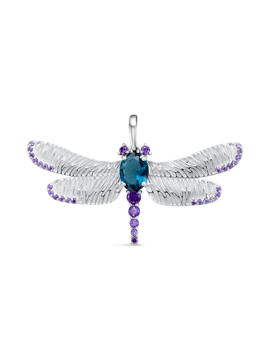 Эффектная подвеска Стрекоза с плавленым кварцем выполнена из серебра 925 пробы с родиевым покрытием. Характеристики. Вставка 1 плавленый кварц 8х6мм цвет лондон топаз огранка овал, 26 недрагоценных фианитов 1мм цвет аметист огранка круг, 1 недрагоценный фианит 3мм цвет аметист огранка круг, 1 недрагоценный фианит 2,5мм цвет аметист огранка круг. Общая высота подвески 27мм, высота подвесной части 22мм, ширина 44,5, глубина 4мм. Внутренняя высота ушка 6мм, ширина 3,5мм. Отличным дополнением к подвеске будет брошь арт.6-06-267-05р. Берегите изделие от воздействия влаги, любых спиртосодержащих растворов и жидкостей, а также парфюма. Для ухода и чистки желательно использовать специальные салфетки для серебра. Приятным дополнением к ювелирному украшению является фирменная упаковка. Значение веса в характеристиках является примерным и может отличаться от фактического.
