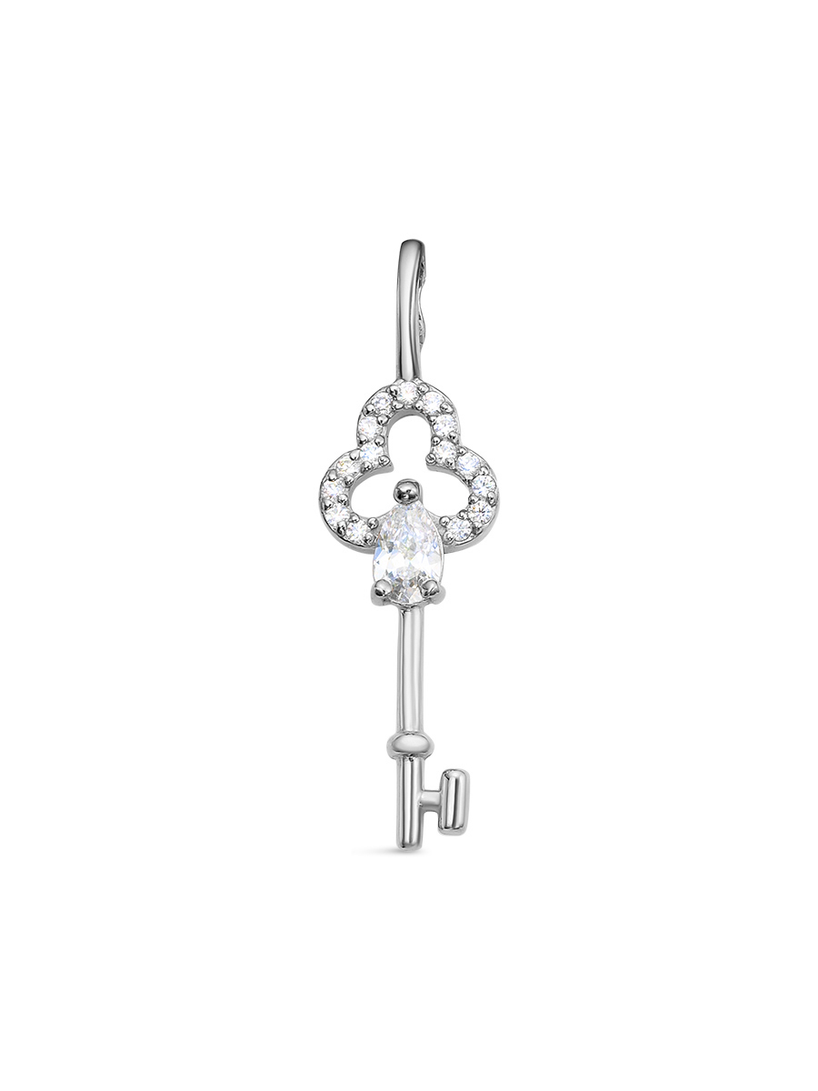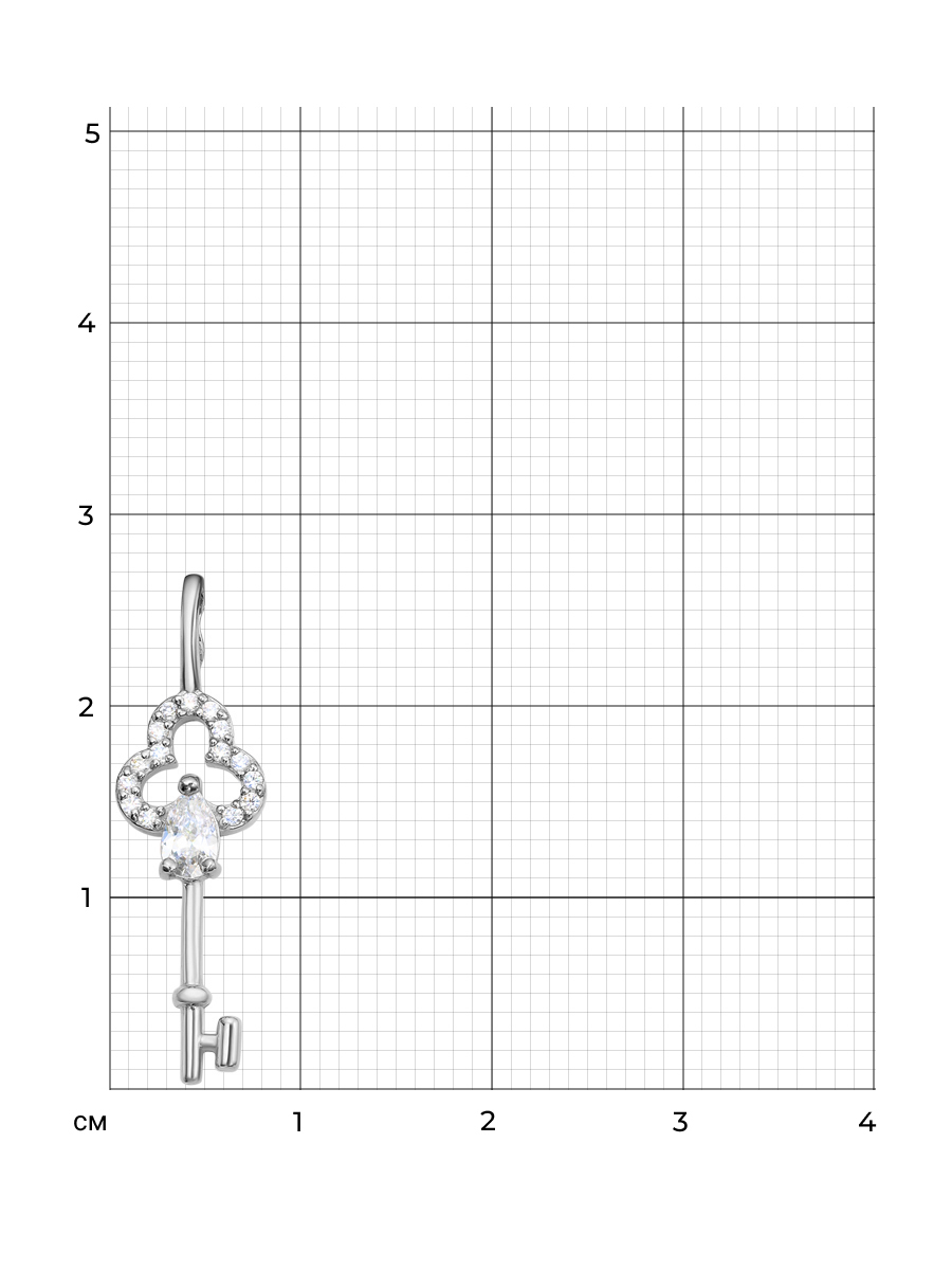 Подвеска Ключ выполнена из серебра 925 пробы с родиевым покрытием. Характеристики. Вставка 15 недрагоценных бесцветных фианитов 1мм огранка круг, 1 недрагоценный бесцветный фианит 5х3мм огранка груша. Высота подвески 27мм, ширина 8мм, глубина вместе с камнем 2,4мм. Внутренняя высота ушка 4,6мм, ширина 3мм. Берегите изделие от воздействия влаги, любых спиртосодержащих растворов и жидкостей, а также парфюма. Для ухода и чистки желательно использовать специальные салфетки для серебра. Приятным дополнением к ювелирному украшению является фирменная упаковка. Значение веса и габаритов в характеристиках примерные и могут отличаться от фактических.