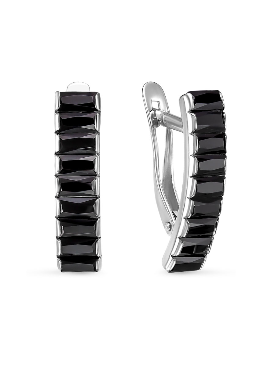 Серьги выполнены из серебра 925 пробы с родиевым покрытием. Характеристики. Вставка 18 натуральных шпинелей 4х2 мм цвет чёрный огранка багет. Высота серьги 18,5 мм, ширина 5,3 мм. Рабочая зона штифта 5,5 мм, размер занижения штифта 3 мм. Берегите изделие от воздействия влаги, любых спиртосодержащих растворов и жидкостей, а также парфюма. Для ухода и чистки желательно использовать специальные салфетки для серебра. Приятным дополнением к ювелирному украшению является фирменная упаковка. Значение веса в характеристиках является примерным и может отличаться от фактического.