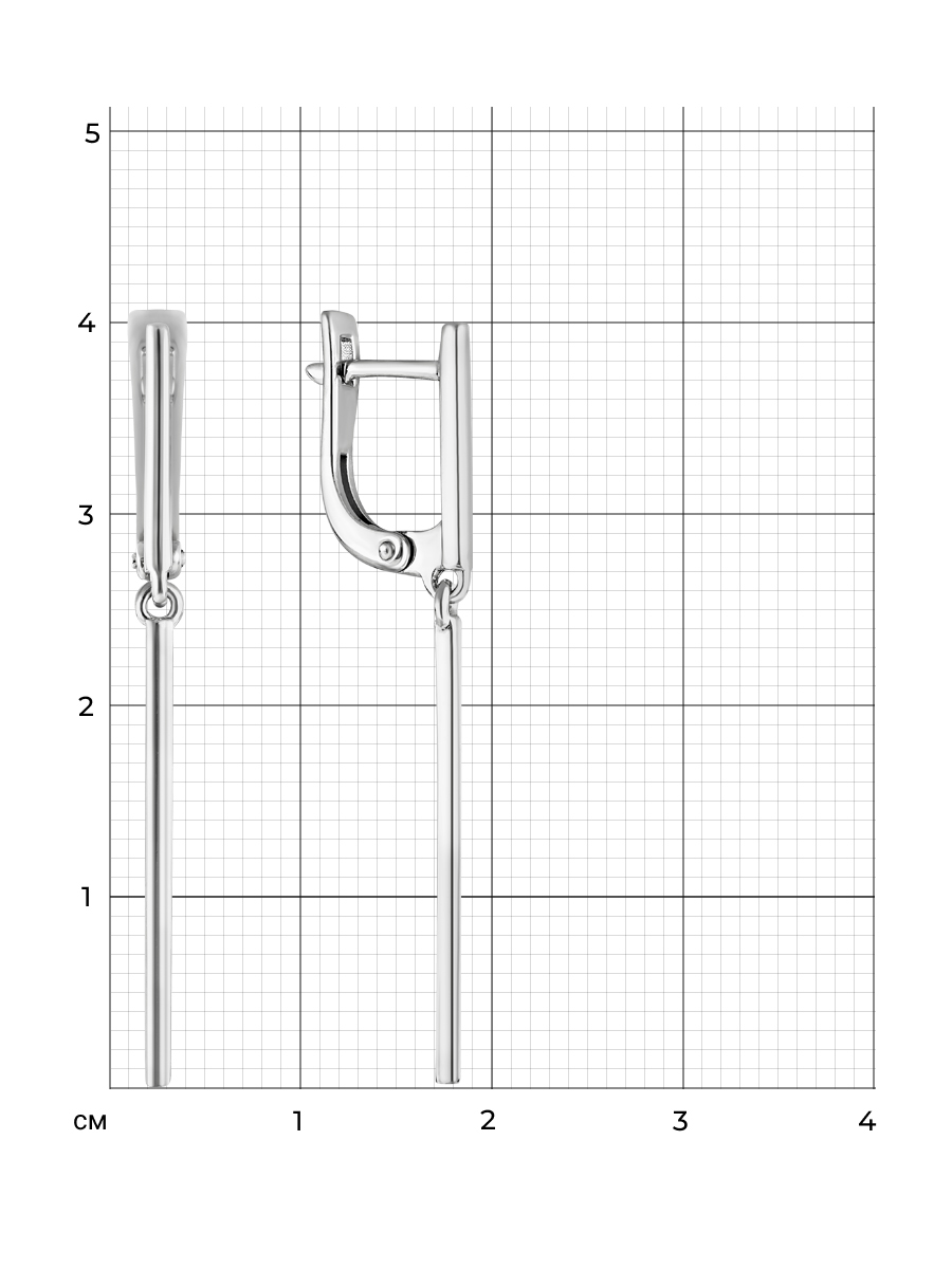 Серьги выполнены из серебра 925 пробы с родиевым покрытием. Характеристики. Общая высота серьги 40мм, высота подвесной части 26,5мм, ширина 1,3мм. Рабочая зона штифта 6мм, размер занижения штифта 2мм. Берегите изделие от воздействия влаги, любых спиртосодержащих растворов и жидкостей, а также парфюма. Для ухода и чистки желательно использовать специальные салфетки для серебра. Приятным дополнением к ювелирному украшению является фирменная упаковка. Значения веса и габаритов в характеристиках примерные и могут отличаться от фактических.