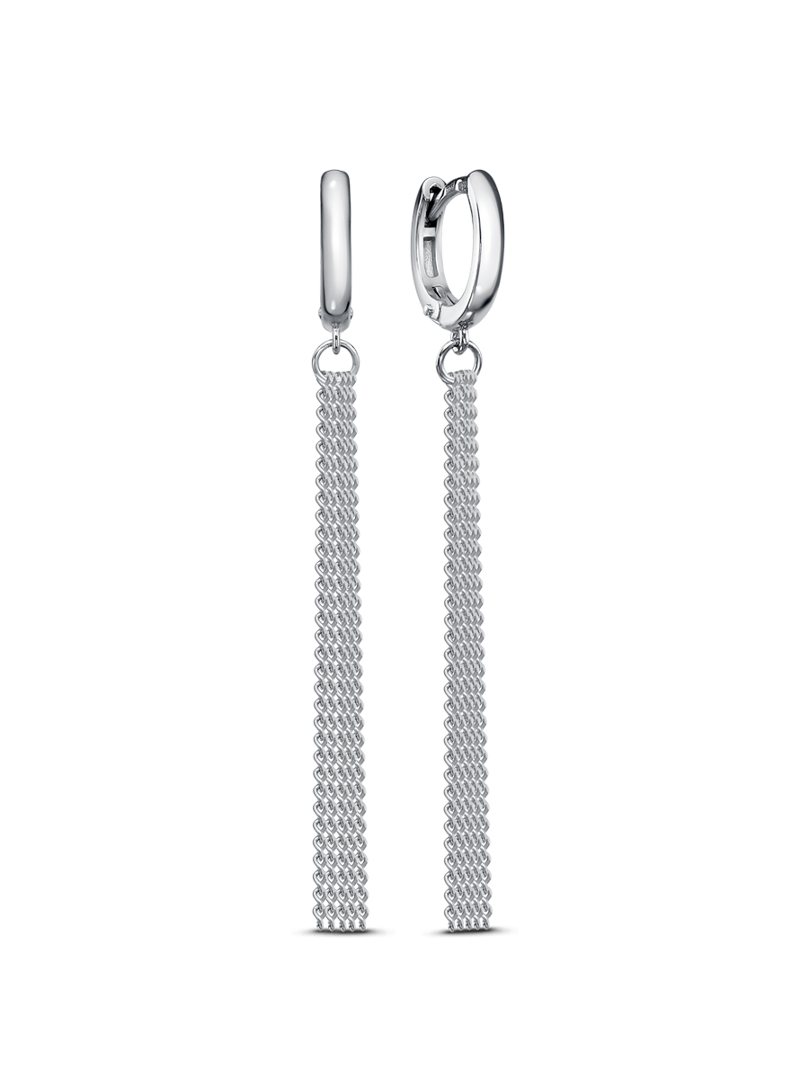 Серьги выполнены из серебра 925 пробы с родиевым покрытием. Характеристики. Общая высота серьги 54 мм, ширина верхней части 2 мм. Цепочек 5 штук, высота каждой 40 мм. Замок английский. Рабочая зона штифта 5,7 мм, размер занижения штифта 0,5 мм. Берегите изделие от воздействия влаги, любых спиртосодержащих растворов и жидкостей, а также парфюма. Для ухода и чистки желательно использовать специальные салфетки для серебра. Приятным дополнением к ювелирному украшению является фирменная упаковка. Значения веса и габаритов в характеристиках примерные и могут отличаться от фактических.