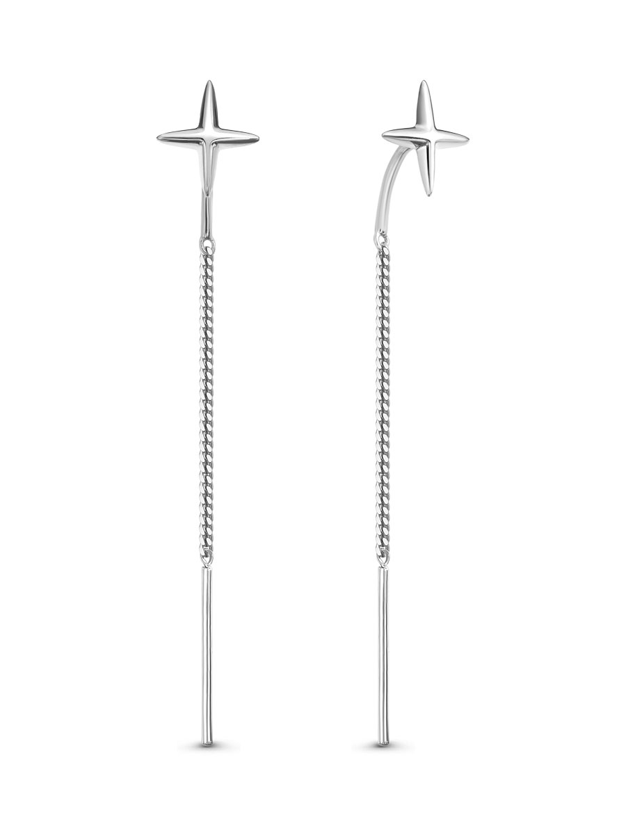 Серьги выполнены из серебра 925 пробы с родиевым покрытием. Характеристики. Общая высота серьги 56 мм. Высота звёздочки 10,3 мм, ширина 9,2 мм, глубина 1,6 мм. Длина палочки 15 мм, толщина 0,9 мм. Толщина крючка 1,1 мм. Рабочая зона штифта 5 мм. Длина цепочки 30 мм. Берегите изделие от воздействия влаги, любых спиртосодержащих растворов и жидкостей, а также парфюма. Для ухода и чистки желательно использовать специальные салфетки для серебра. Приятным дополнением к ювелирному украшению является фирменная упаковка. Значение веса и габаритов в характеристиках примерные и могут отличаться от фактических.